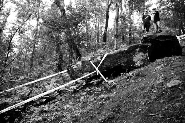 The course is littered with rocks but none as big and as awkward as this one. The entry is relatively fast and the feature is so large you are hitting it totally blind making line choice on the landing particularly hard. There is a stump and a rut on the lander and you want to aim between them to get a good line for the next awkward S bend corner. We may well see riders hitting the tree at the exit if they fail to scrub off enough speed or land in a bad spot.