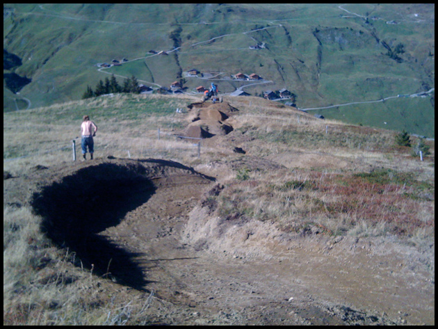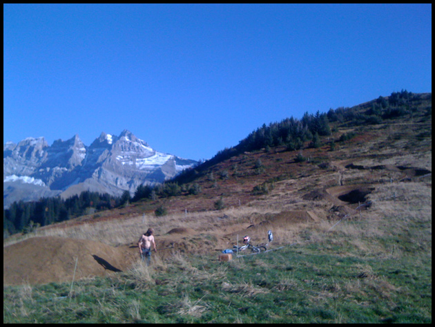 Will, Joel and I rebuilt the Crosets 2 trail in Champery this last fall. Eric the winter ski patroler was driving the Kaiser walking digger. The trail is lots of fun now with huge berms, a couple jumps and lots of lines to pass your friends in the corners. We were having a blast on it right up until the snow came and then it was over for the winter. We didn’t even get to ride the second half of the trail before the snow came. Now it is under a ski run until next spring.