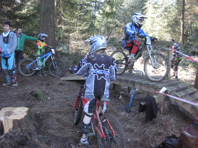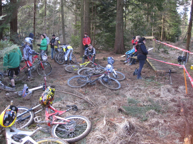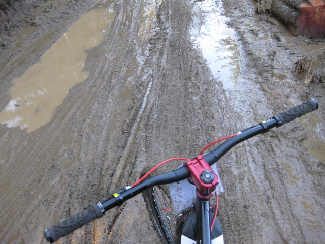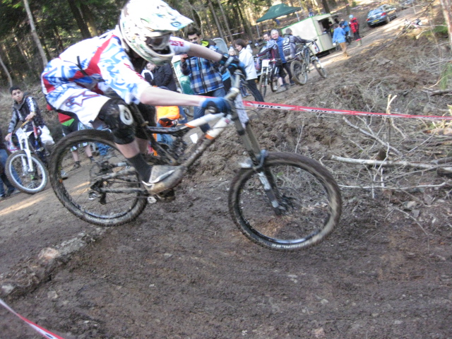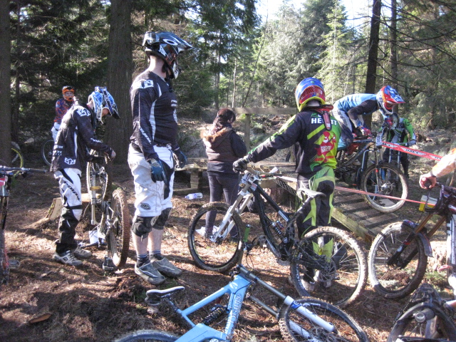 We expected the whole track to be like brown soup, but only parts of the fireroad were this bad. Still glad I lashed on a front mud flap though. Practice was nice and mellow, few new bikes rolling around, gossip on who is waiting for this seasons racer to arrive, excitement over the BDS being back at Combe Sydnham country park again (April) and expected crowd turnout should be bigger than last year (must go and have a look see there pre-race).