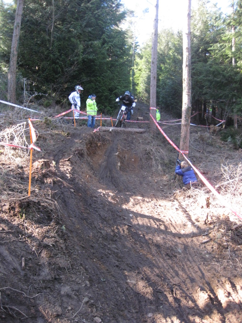 Yeah…from the top of the last four photos then, Ben Deakin checking out line choices from the other side of the tape, next photo, out of shot is the super wide line aka the chicken run but we can’t call it that anymore. I ran the really tight inside line as the camera man would have been a soft landing unless I hit the tree first, used my big wheels to smash through the scooped out ground, the middle line had some little poking out stumps, being rigid that would have been real bad for me if the front wheel clipped one.