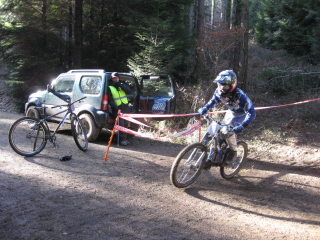 First to run were the little rippers, with much cheering from the grown ups waiting there go. Sprint start, gentle slope, choppy ground, into the trees and roots, then drop in to the first road crossing, some nice tight turns, not steep but fast if you carry speed well.