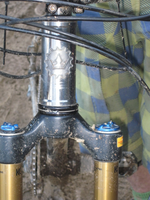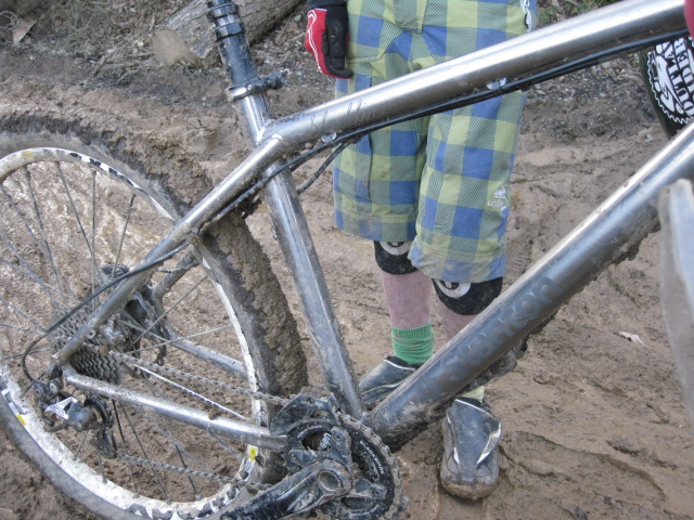 Slightly hard going on the rigid Karate Monkey, could have done with having the wheelbase slammed for the turns, the v-brakes worked, bit of rim deflection under heavy braking so came a bit close to playing with trees. Two-pawl freewheels suck in tight sprinty tracks, really must get a proper wheelset. Did get a bit of pisstaking (expected) over the bike, but quickly pointed out mines been down Glencoe and Fort William, one of the few bikes there that could claim that, and of course the only bike to hand thats raceable for me. Chris Lamely did then point out if I asked him I could have borrowed his steel Stanton Slackline as he had a loaner Titainium prototype to play with, got him to keep still for more than a minute and got some snaps of it, should be available around May I belive (no idea how much though), looks nice though.