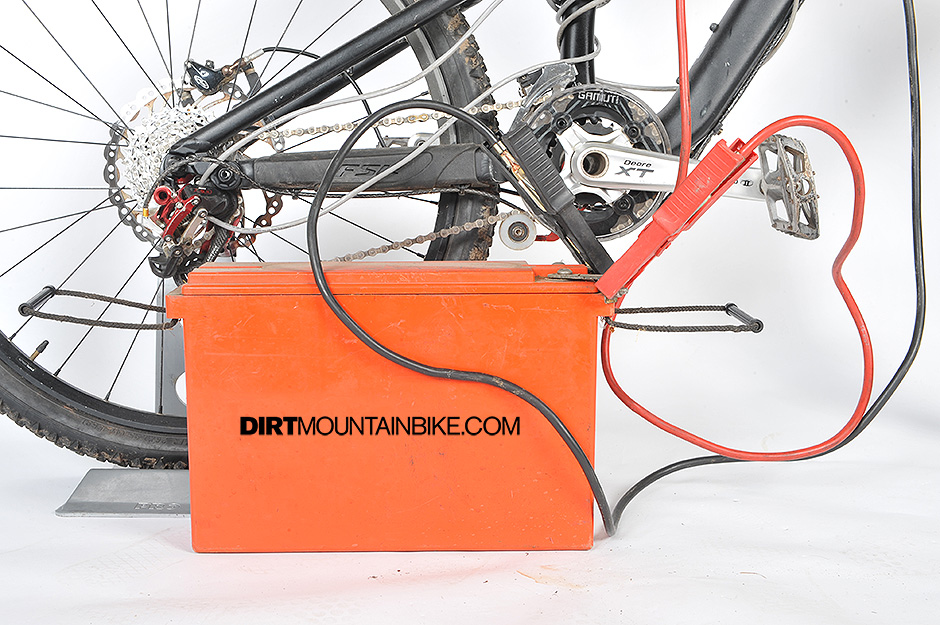 Obviously this system needs some kind of power supply, and this is taken care of via a remote battery pack. Ivor was keen to make sure that the weight of the bike was increased as little as possible and so this battery is designed to either be towed in a trailer or carried in a back pack. And, if you’re wondering why the whole system uses quite so much cable it is because the computing power is so fast that Ivor has actually had to slow down the transfer of information by using longer cables. If he were to fit shorter ones it would be reacting to things that hadn’t even happened yet.