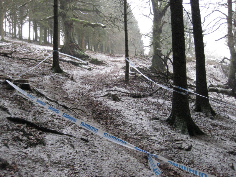 The entry into the woods, the point of a crash in Seb’s video. Frozen ground and ice everywhere. The woods have had a make over with berms being re-cut and smoothed out. The tape is to point riders the right way down as there are loads of line choices through the woods. Again work in progress and final route will be taped on the Friday before the race.