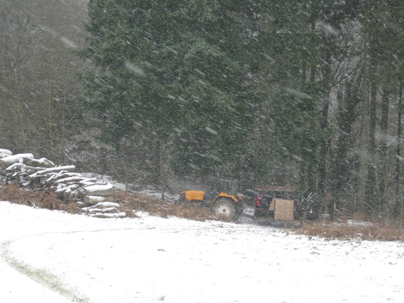 As you can see, weather was a tad off today. I had to push the ISO to 1600 to get a fast enough shutter speed in some places, camera didn’t like the snow and cold, nor did I for that matter, Don was cooped up in the cab of the tractor with the heater cranked up, best place to be. From the double double, which is bigger than the old set, you power down to the track, entry is smoothed over, you then exit back across the field, this is a smooth high speed transition (skimmer) into some bermed turns for the new entry to the lower woods. The old line was exit the double-double then blat straight down the track and straight into the woods, now more fun and a bit more length. The trees that marked the old entry have been cut down and turned into a ramp.