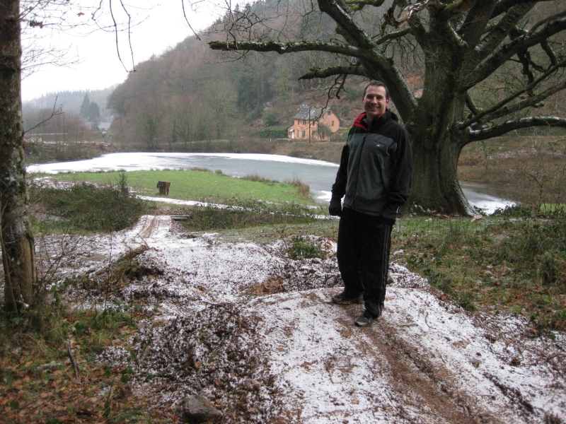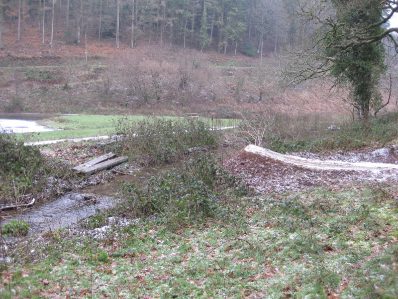 Despite the snow you can track the new line into the woods. The old one went round the bracken on the left of the photo. The line into the woods haschanged, but then becomes Combe Sydenham classic to the jagged rock drop. Final taping will decide where the track winds out round the rocks. A new double has been put in near the finish, I bumped into John Cobb here, who was also checking out the track (he should be racing it, I won’t)