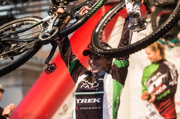 29” for most of the season Tracy lifts her bike on the podium in Finale.