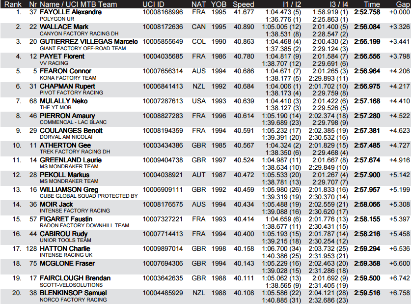 After qualifying in 52nd, Fayolle went down in dry conditions but take nothing away from his time, it was on par with Loris Vergier’s top time from yesterday. He takes away his first win and the first World Cup win for Polygon.