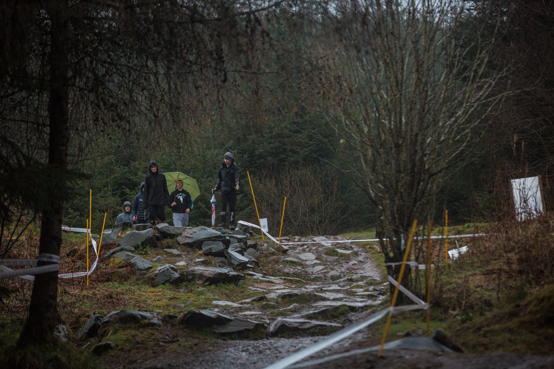Friday at Ae Forest was better suited for canoeing. Unfortunately though, the Shimano British Downhill Series season is upon us so track walk was the order of the day. Dressed to the eyeballs in waterproofs, riders braved the consistent rain to feast their eyes on the track here at Ae Forest.