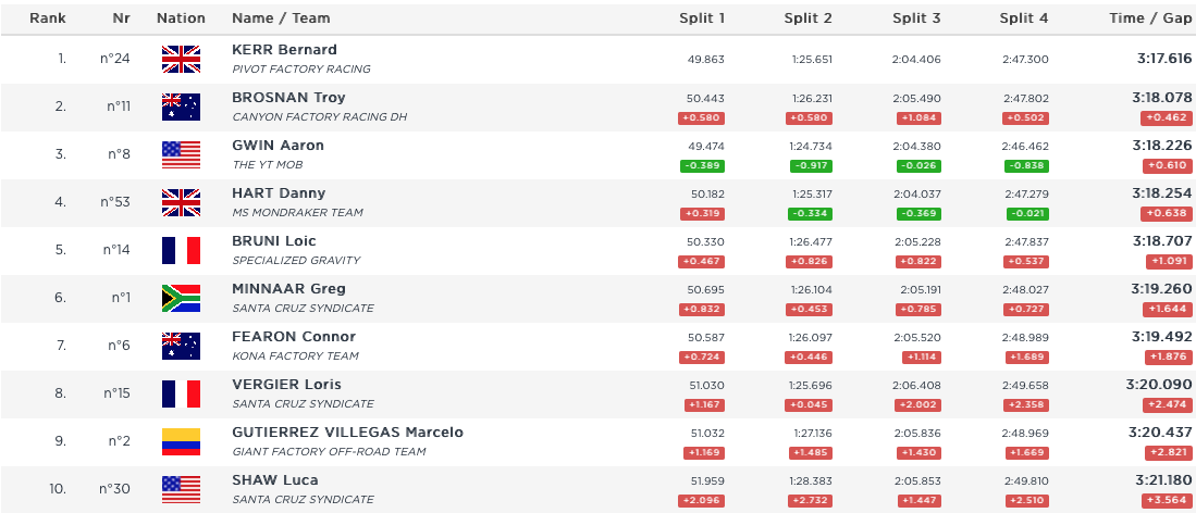 Kerr wasn’t one of the riders to speak out against the supposedly easy track and he let his riding do the talking instead setting as he went for broke with a run that was a good half a second faster than second placed Troy Brosnan. Watch out for Gwin in third though, he was 0.8 up on Bernard’s time at the final split before either backing off or making a mistake to roll down third.