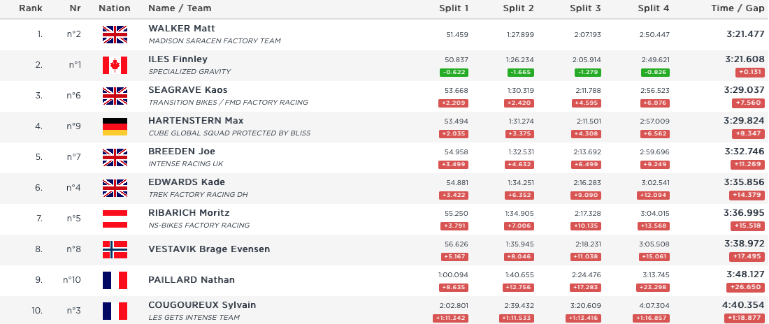 Danny Hart was also up at the final split (although only by 2 hundredths of a second) and he also must have backed off to finish fourth. Loic Bruni rounded out the top five.