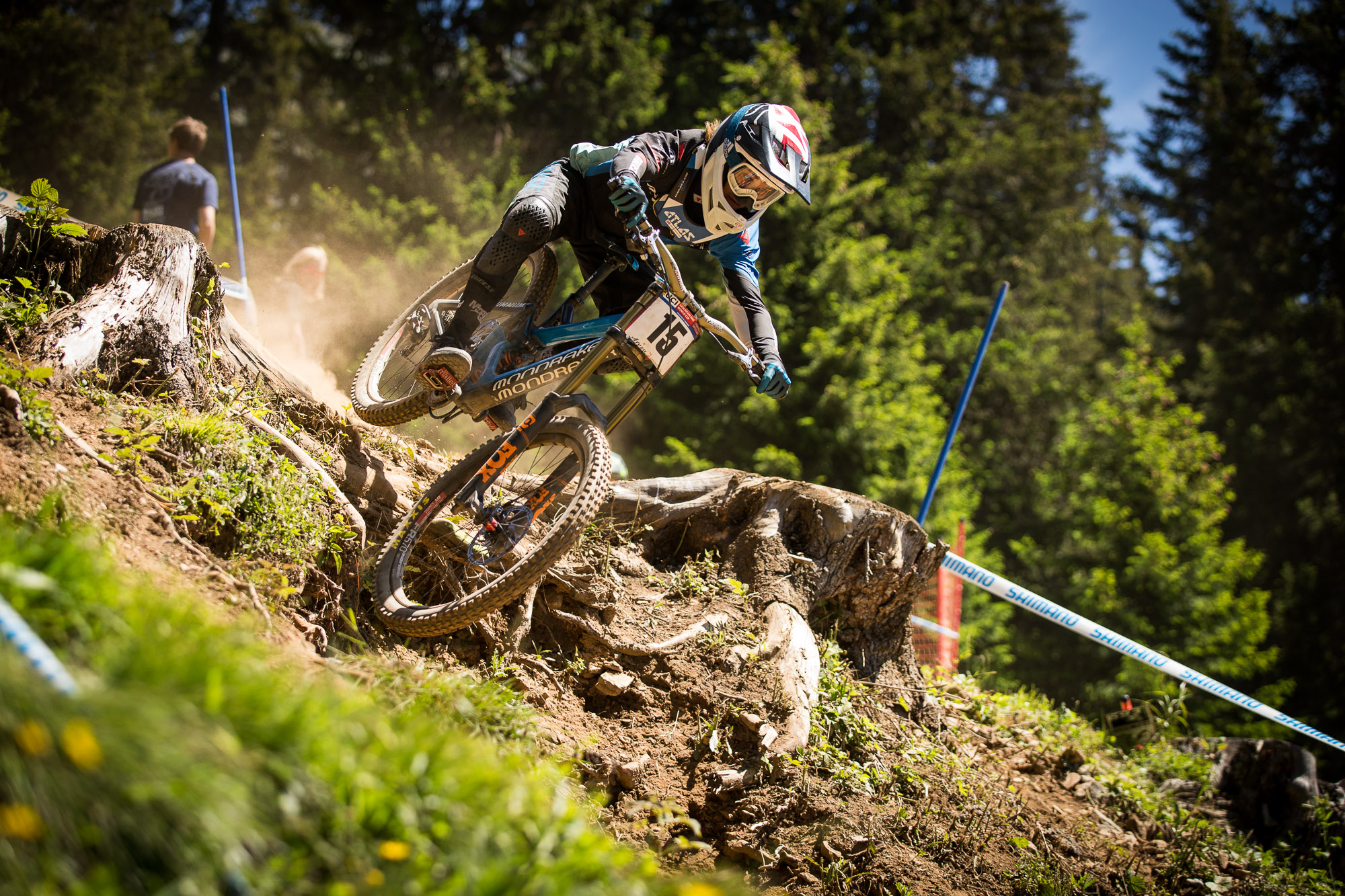 The track is pretty much the same as last year: linking sections of woods, rocks, jumps, and zig zagging multiple bermed turns (some tight and twisty others that wouldn’t look out of place on a motocross track they are so big). The hill has a kind of tiered feel to it, with steep sections that kind of level off leading to even steeper sections. Not quite waves and troughs, but it certainly does get pitched down in many places.
