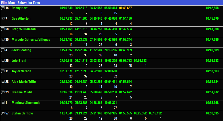 Hart laid down a time of 4:42.558 with Gee roughly 2.5 seconds back. The fastest 650b bike belonged to Greg Williamson who finished third on 4:47.398.