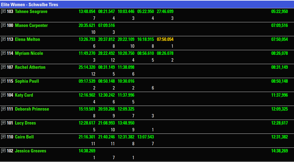 In the women’s field, Tahnee went fastest on 5:22.950 on her new 650b Transition, but with Manon nearly two minutes back in second, it looks like nobody else was pumping out full runs.