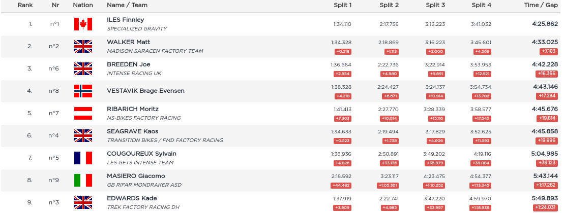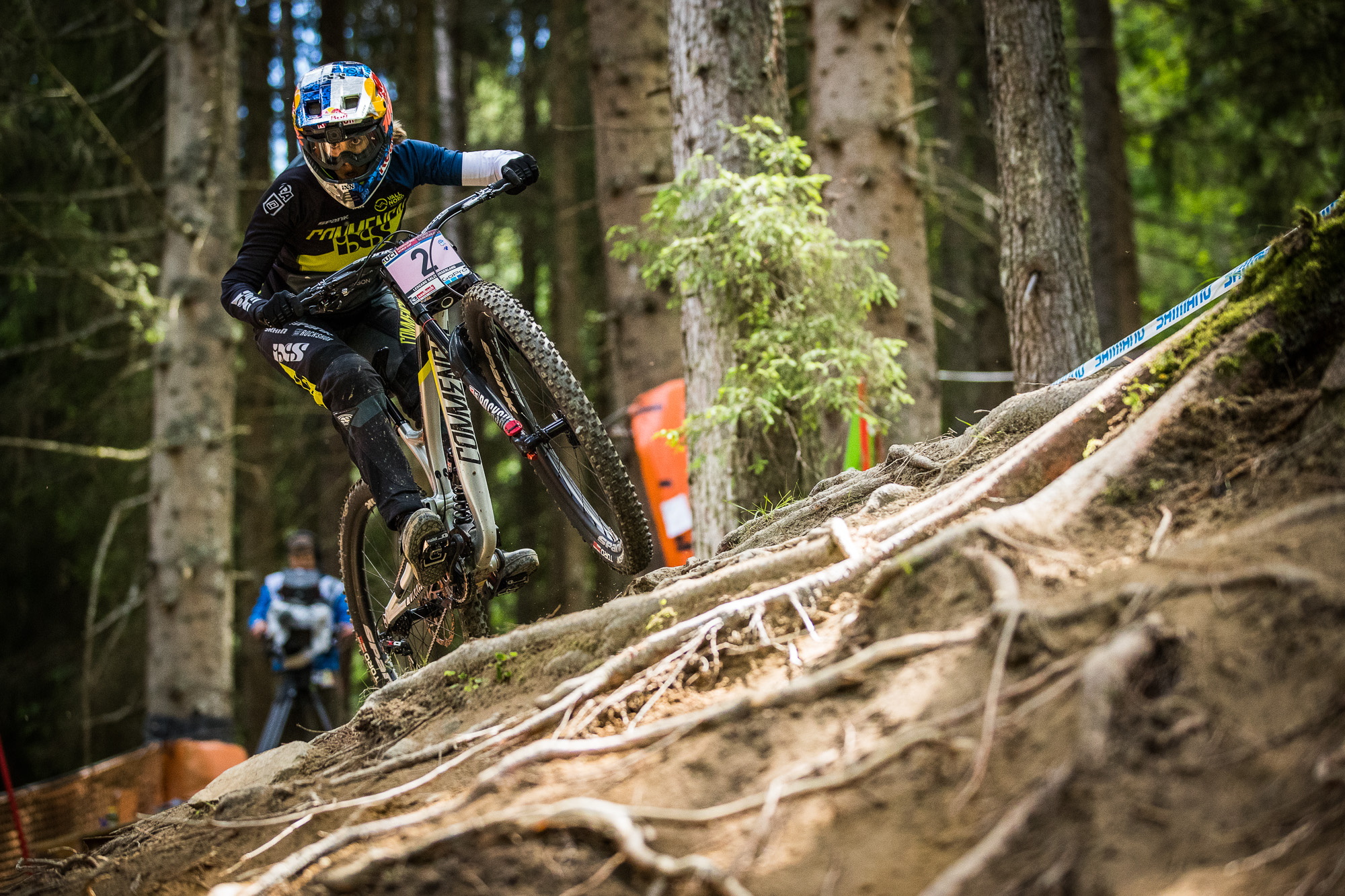 Hart was joined at the top of the results sheet by Troy Brosnan, the two are clearly on form after both winning Crankworx downhill races in the past few weeks. Third went to Amaury Pierron, this was no fluke, the boy was looking rapid on track all day. Greg Minnaar posted the first 29er on the timesheet as he sprung a late run to sneak in fourth. George Brannigan (who has also swapped back to 27.5inch wheels) was fifth.