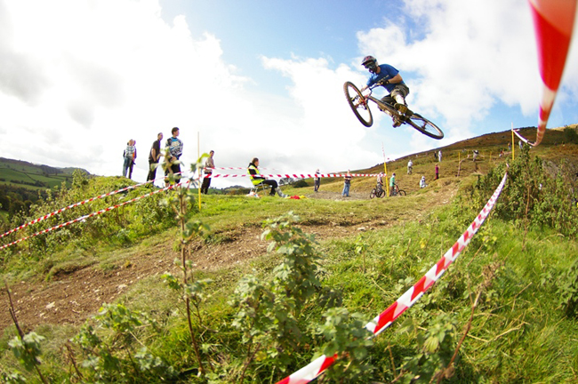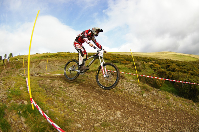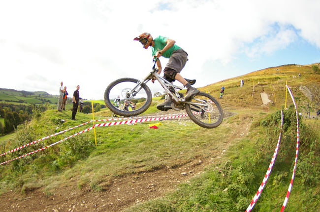 Now comes the bit that anyone has ridden into a headwind dreads – the infamous Moelfre straightaway. Pedal, pedal, then pedal some more. Try not to worry about pinch-flatting on the occasional rocky bits, and try not to fall off of the RH side of the track on the slight left-hander deviations. Eventually you’re relieved to come to the jump past the wall, knowing that means the end is – with no trees on the hill, literally – in sight! Sprint across the grass, cut right, control the braking bumps, then left into braking bumps so big you can double them up now, hard right, down the slab drop, please the crowd with a big whip off the fade drop, then worry about your spleen and other internal organs as you blast through the 30mph+ double-compression with the ever-inviting gatepost on the outside of the corner… Eek!