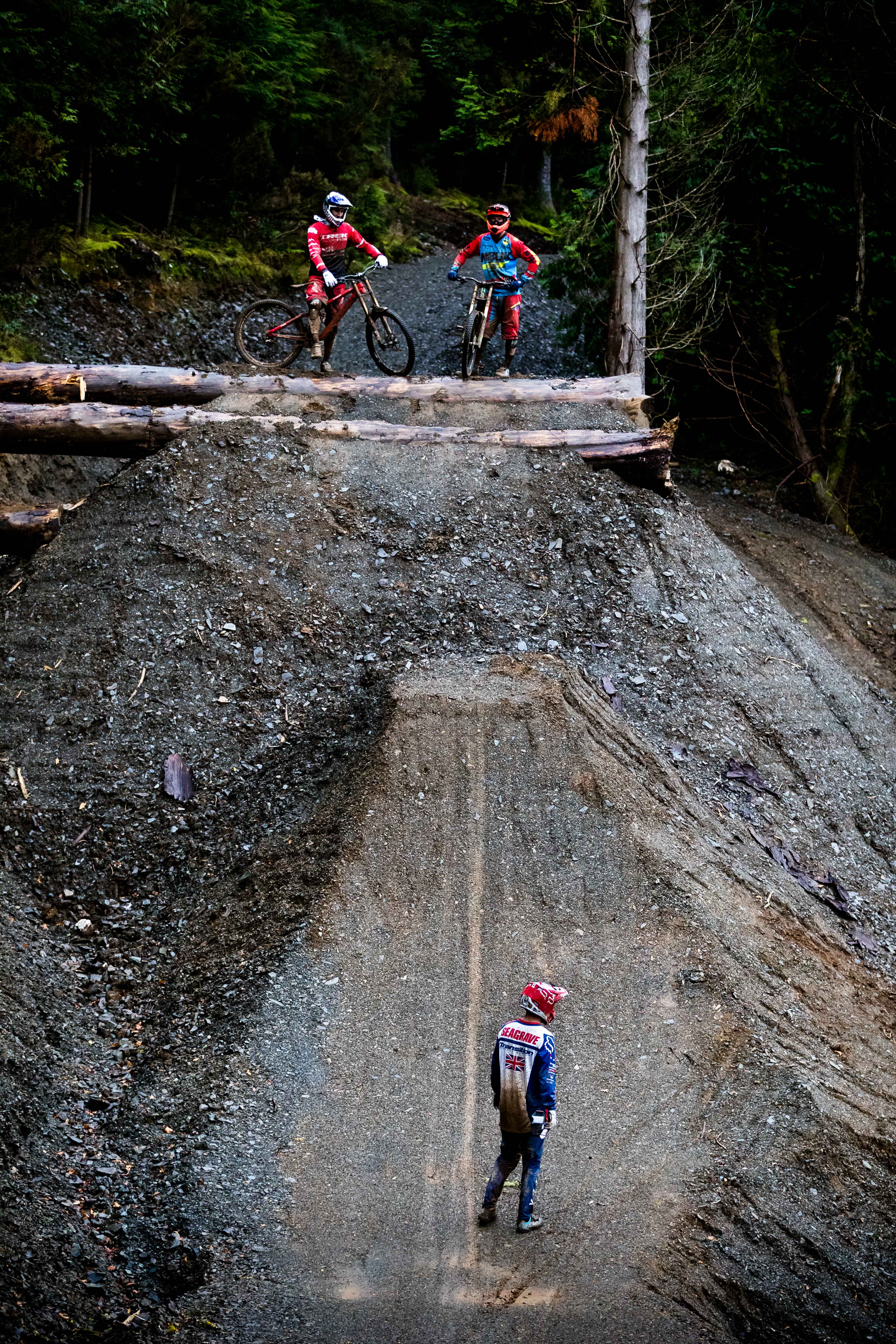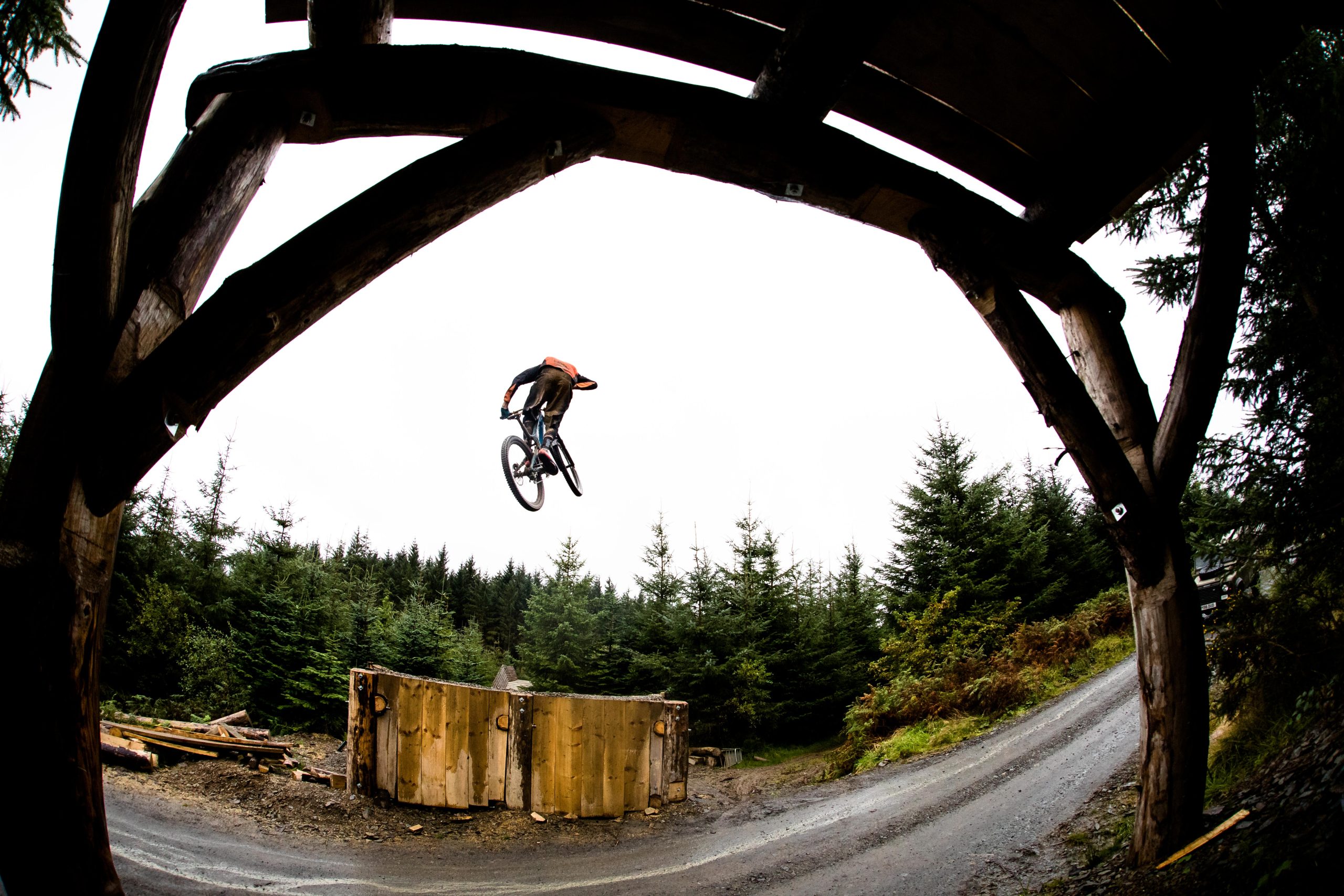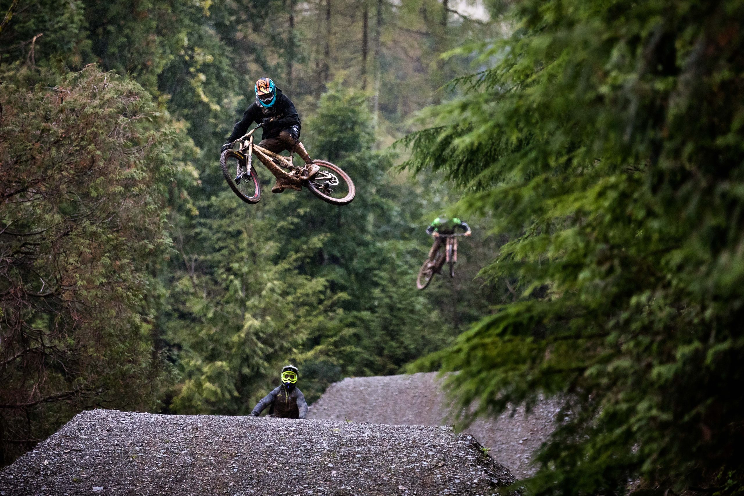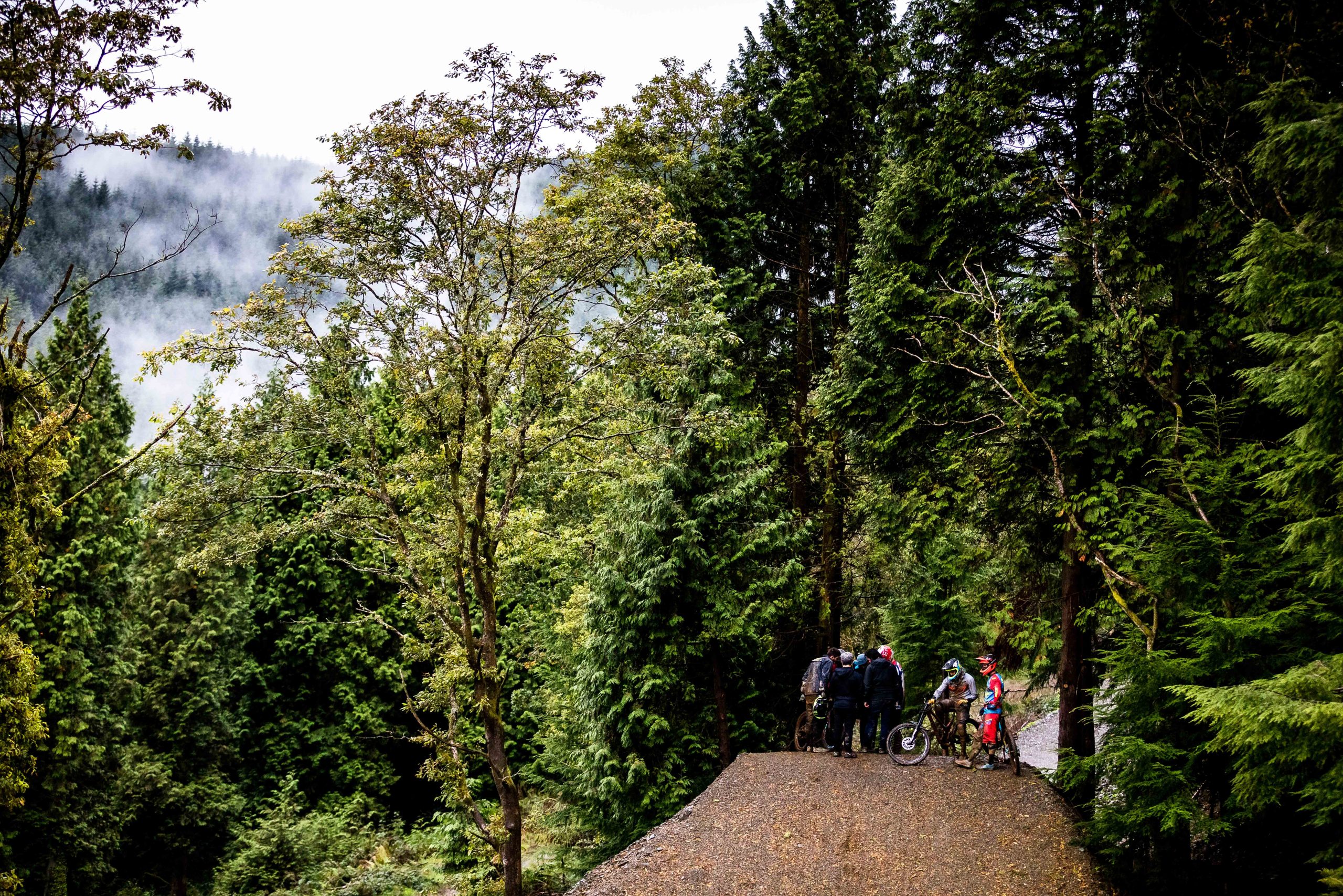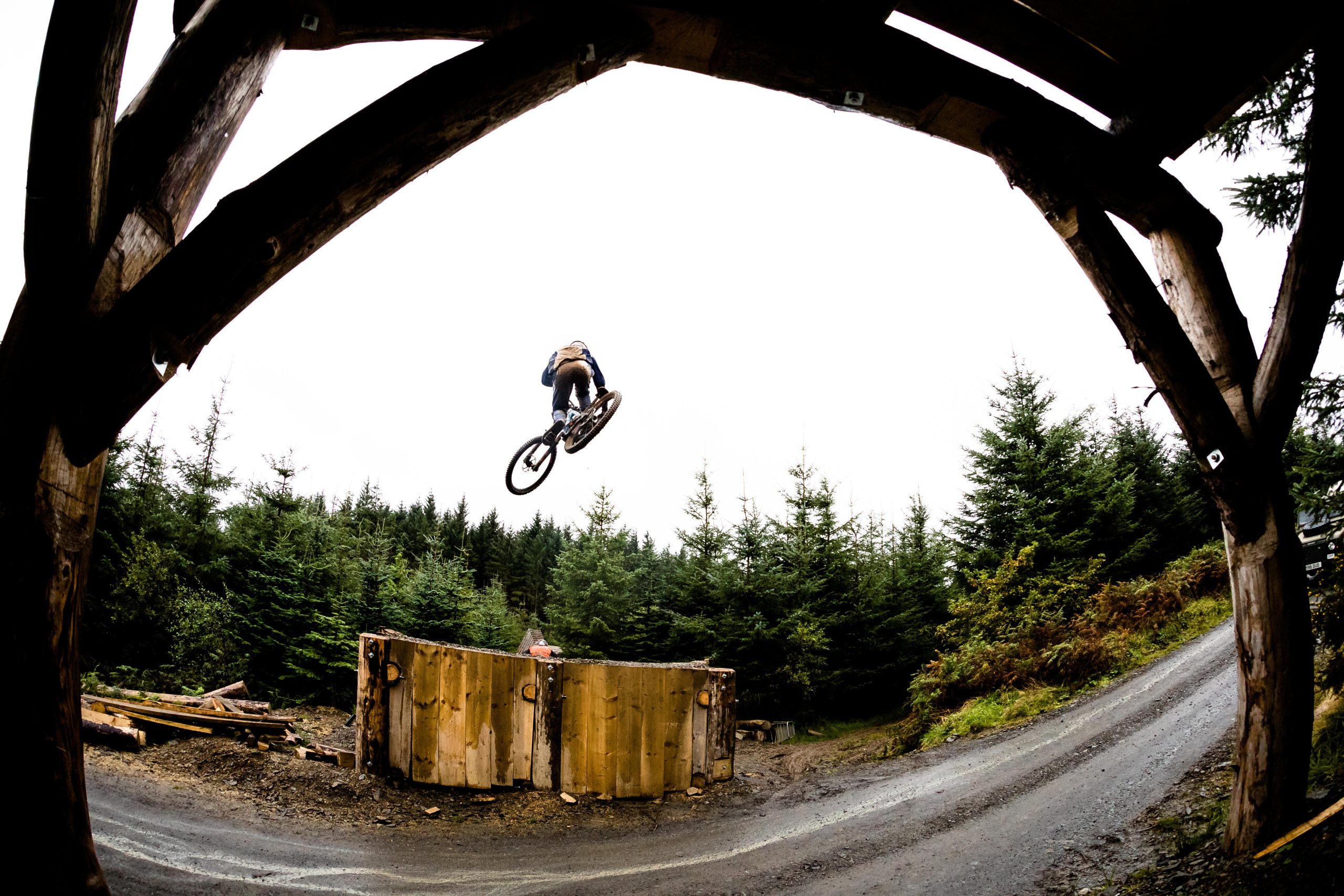 In North Wales, Dan Atherton has been tweaking his monster course to be ready for the first sends on Friday. As a warm up, he invited the racers to his other creation in the DyFi forest to get used to the wet, slatey conditions and the feeling of riding big jumps again.