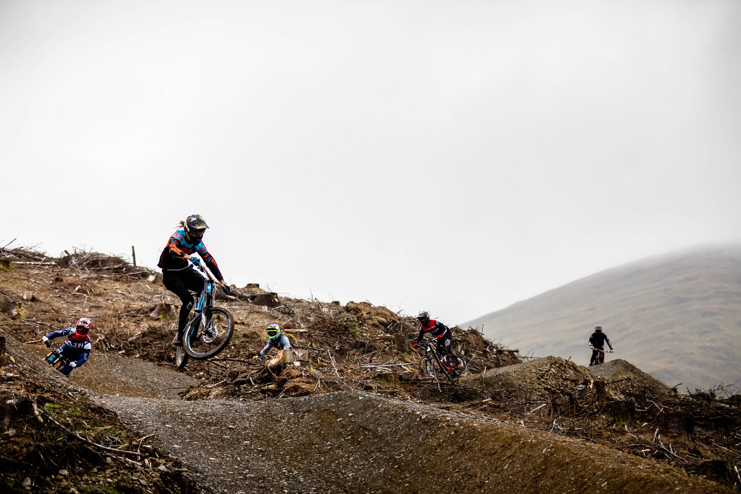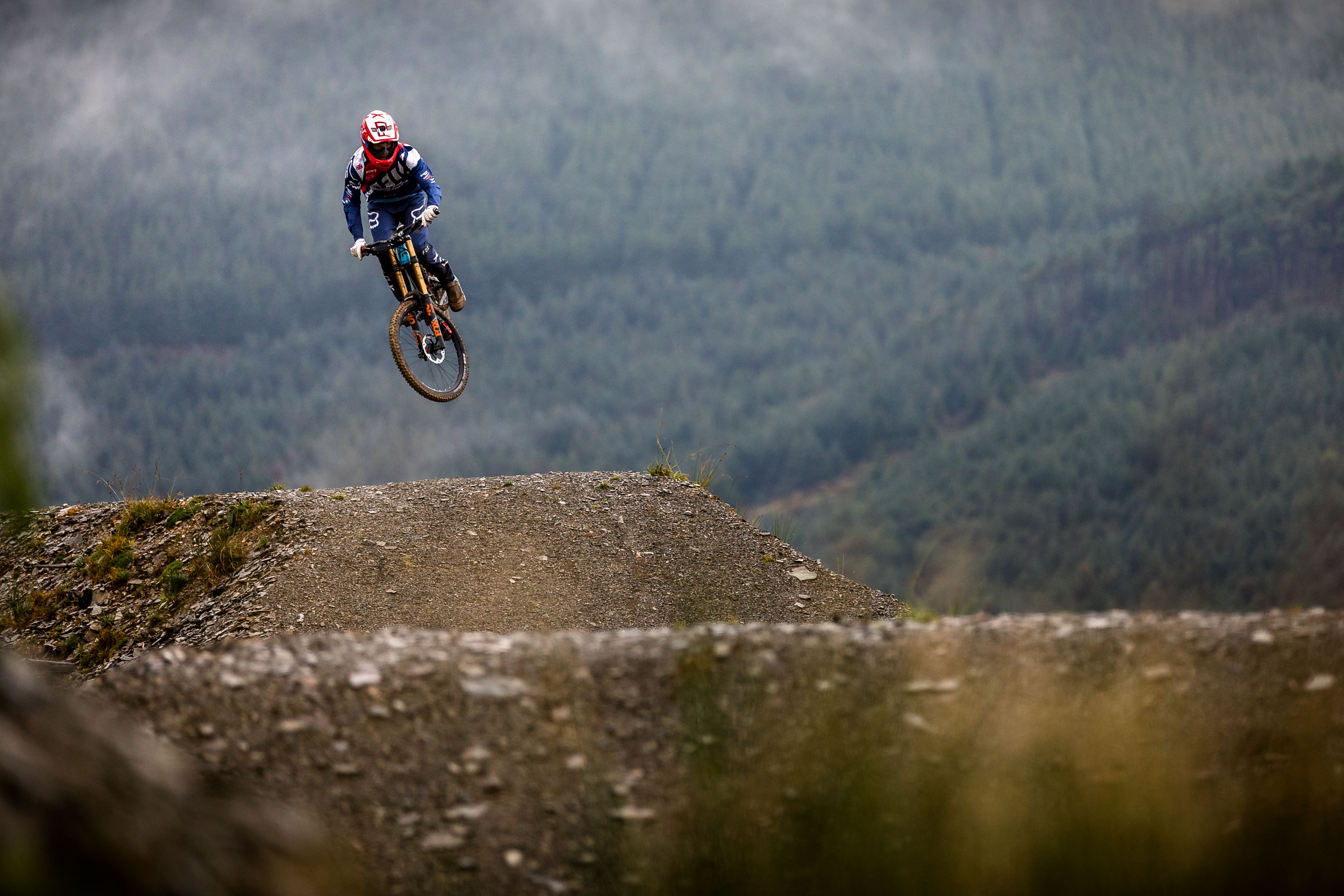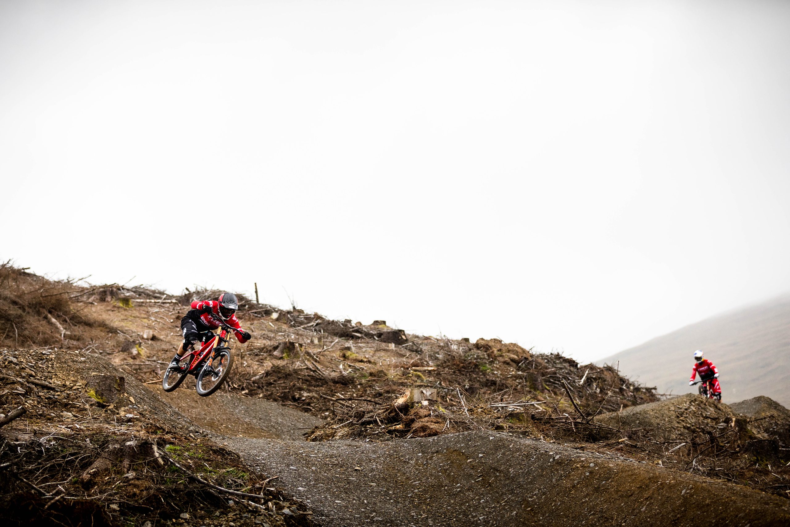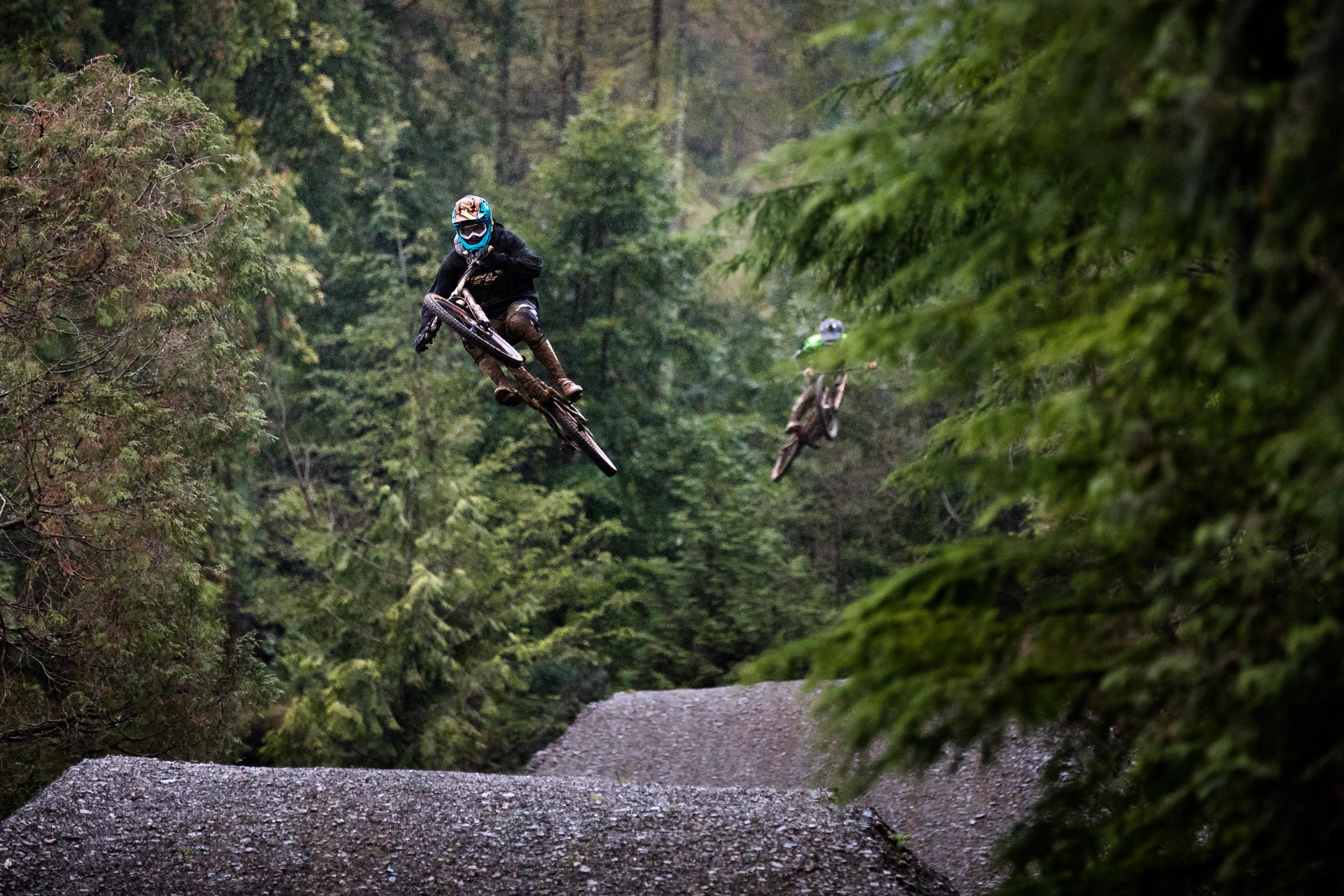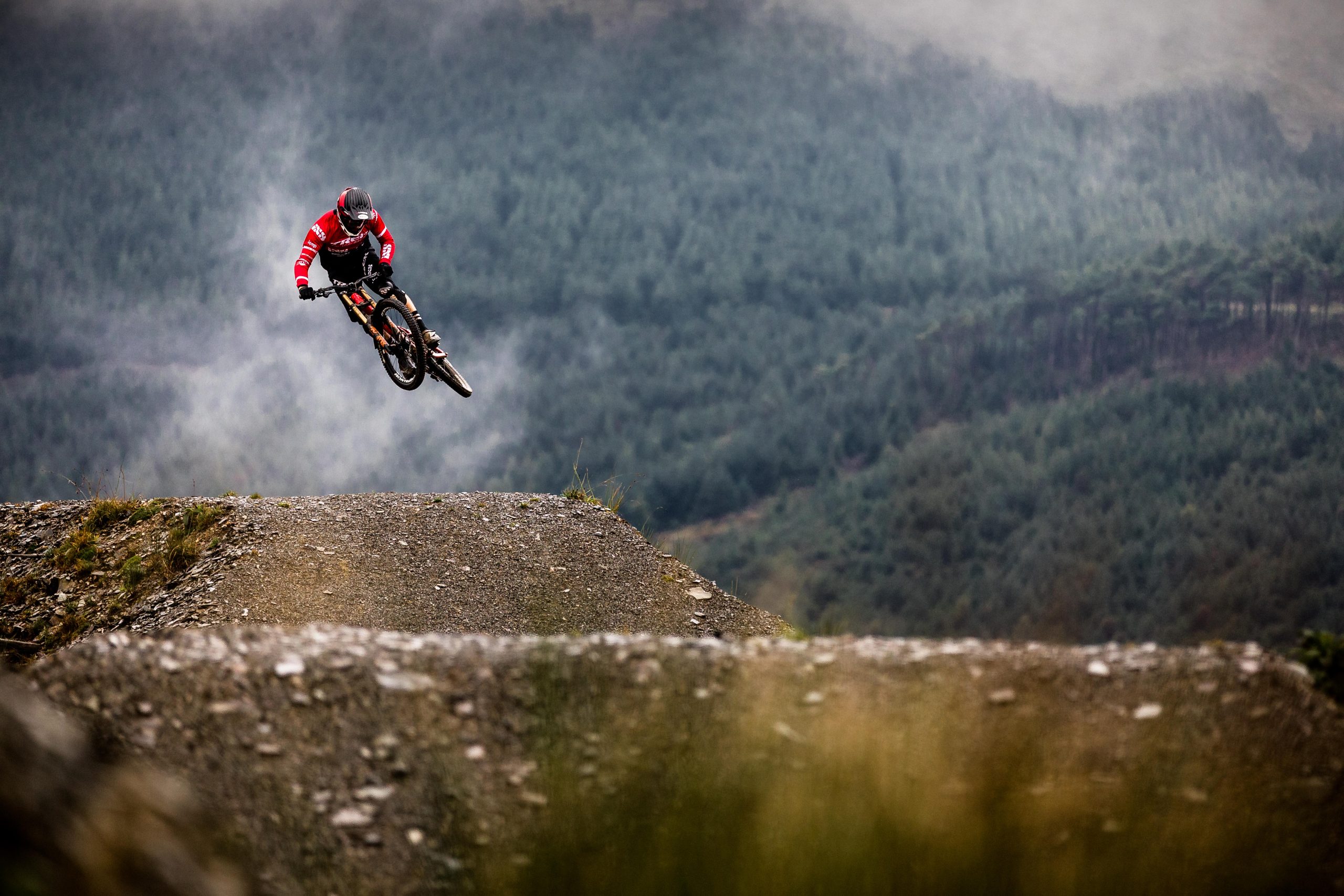 In North Wales, Dan Atherton has been tweaking his monster course to be ready for the first sends on Friday. As a warm up, he invited the racers to his other creation in the DyFi forest to get used to the wet, slatey conditions and the feeling of riding big jumps again.