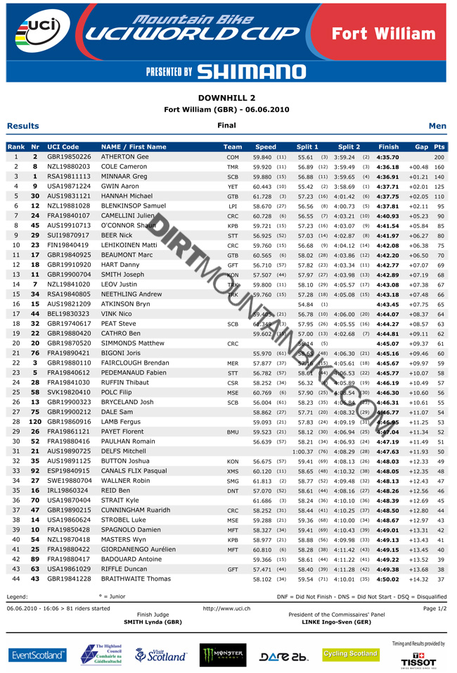 Who will cut the mustard? Who will seal the deal? Is Greg going to reset the balance after a mechanical (allegedly) cost him the win in 2010? Will Gee make it two from two at Fort Bill? Or will Aaron Gwin and Cam Cole have something to say about it? If you just can’t make your mind up here’s last year’s results from the Fort.