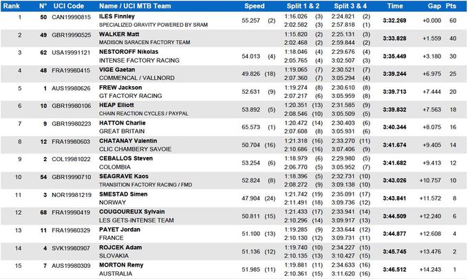 The sun is out, with some clouds dotted around, but the course is beaten up to hell, very physical, greasy and sticky in places (but drying). Canadian Finn Iles (and first year Junior) raced to victory winning by 1.5 seconds from a storming Matt Walker. Frenchman, and winner of qualifying, Kevin Marry posted the fastest times on all three splits but then went ‘off the radar’ and crashed out in the final section. We hope is OK.