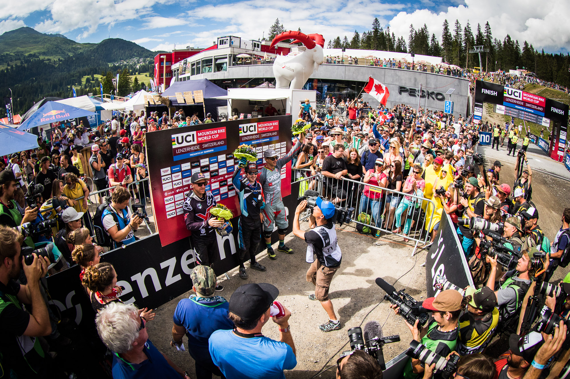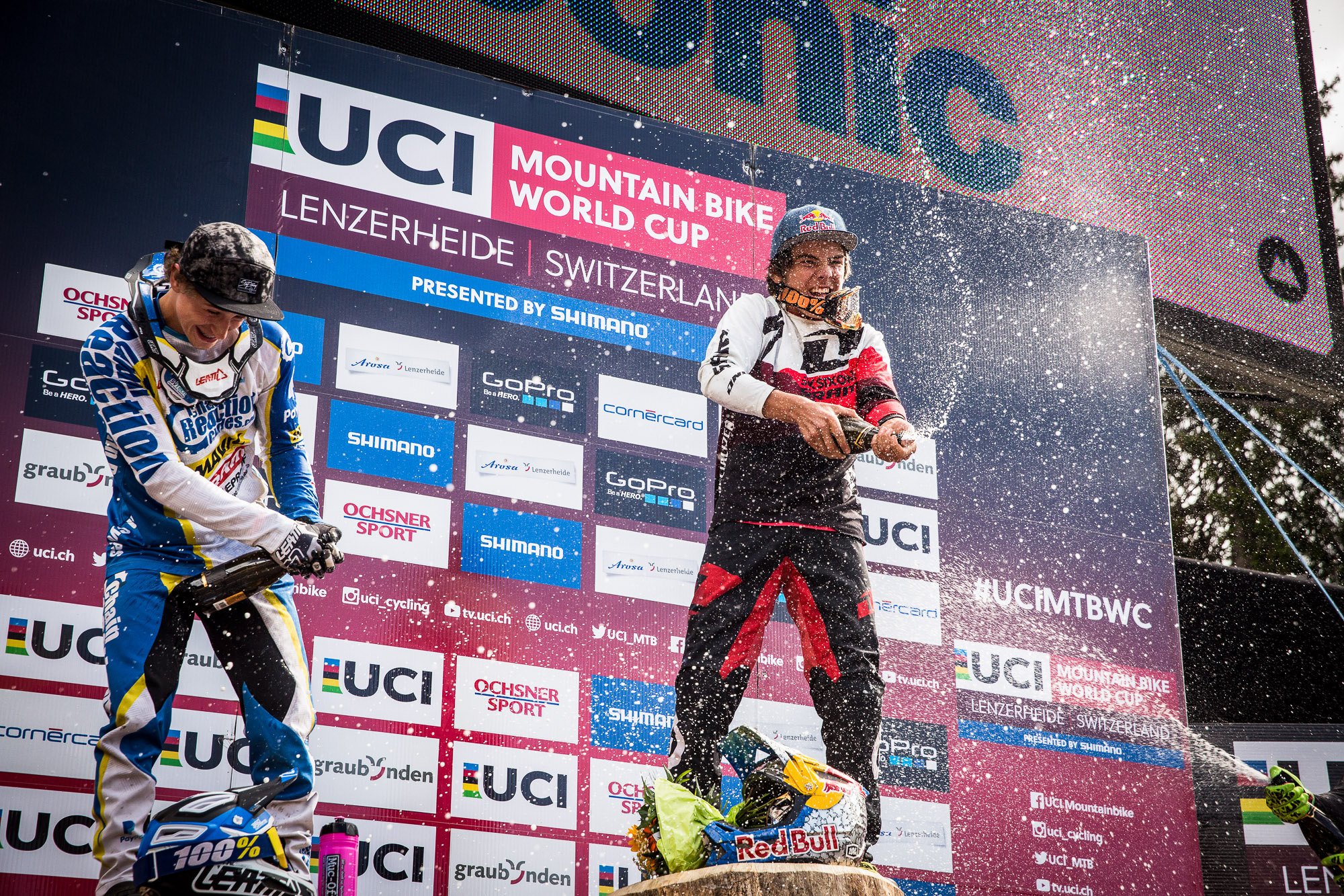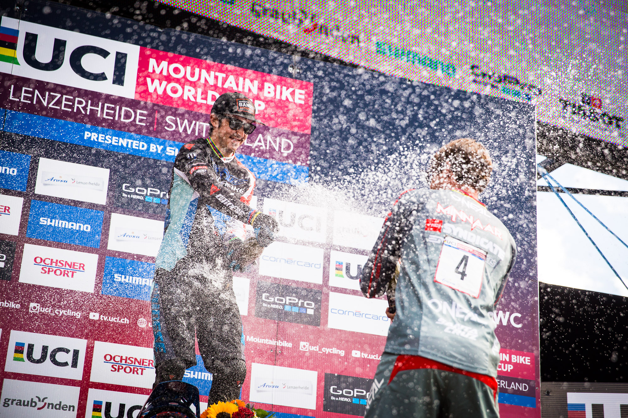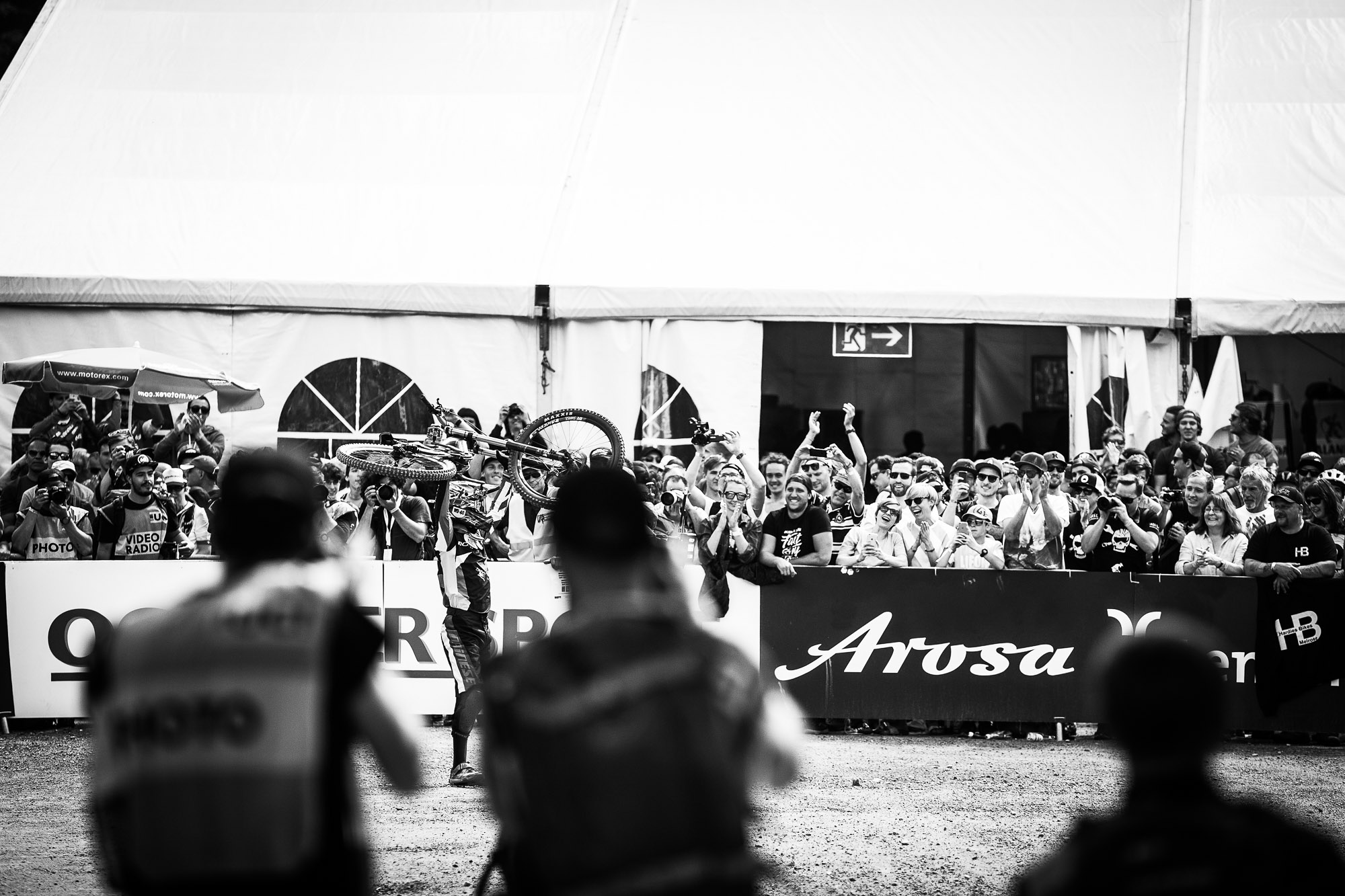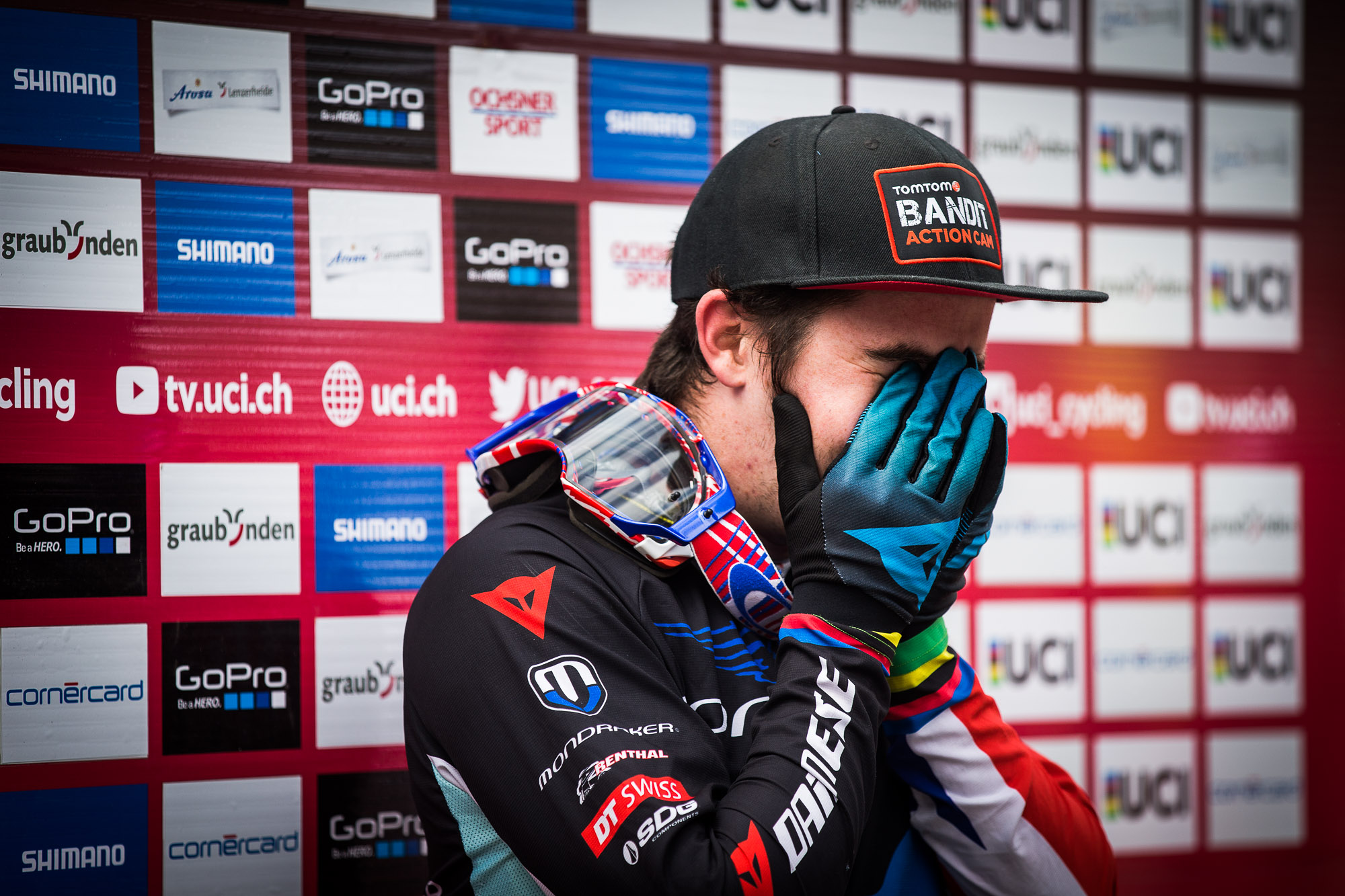 I don’t mind admitting that I thought he’d lost it. Gwin is such a powerful and compact rider, one who carries momentum and speed so well, that this gap of almost a second was too much to make back in around 25 seconds of track… if anything I had expected the time gap to grow a little. But something weird happened. The crowd was going ballistic as Danny crossed the line a mere 0.096 of a second faster than Aaron Gwin. This was the stuff of dreams, of fairy tales. The whole place just went mental. Bike above his head, cameramen everywhere and in the middle of it all a bloke from Redcar who had just won his first World Cup. You really couldn’t make this stuff up.