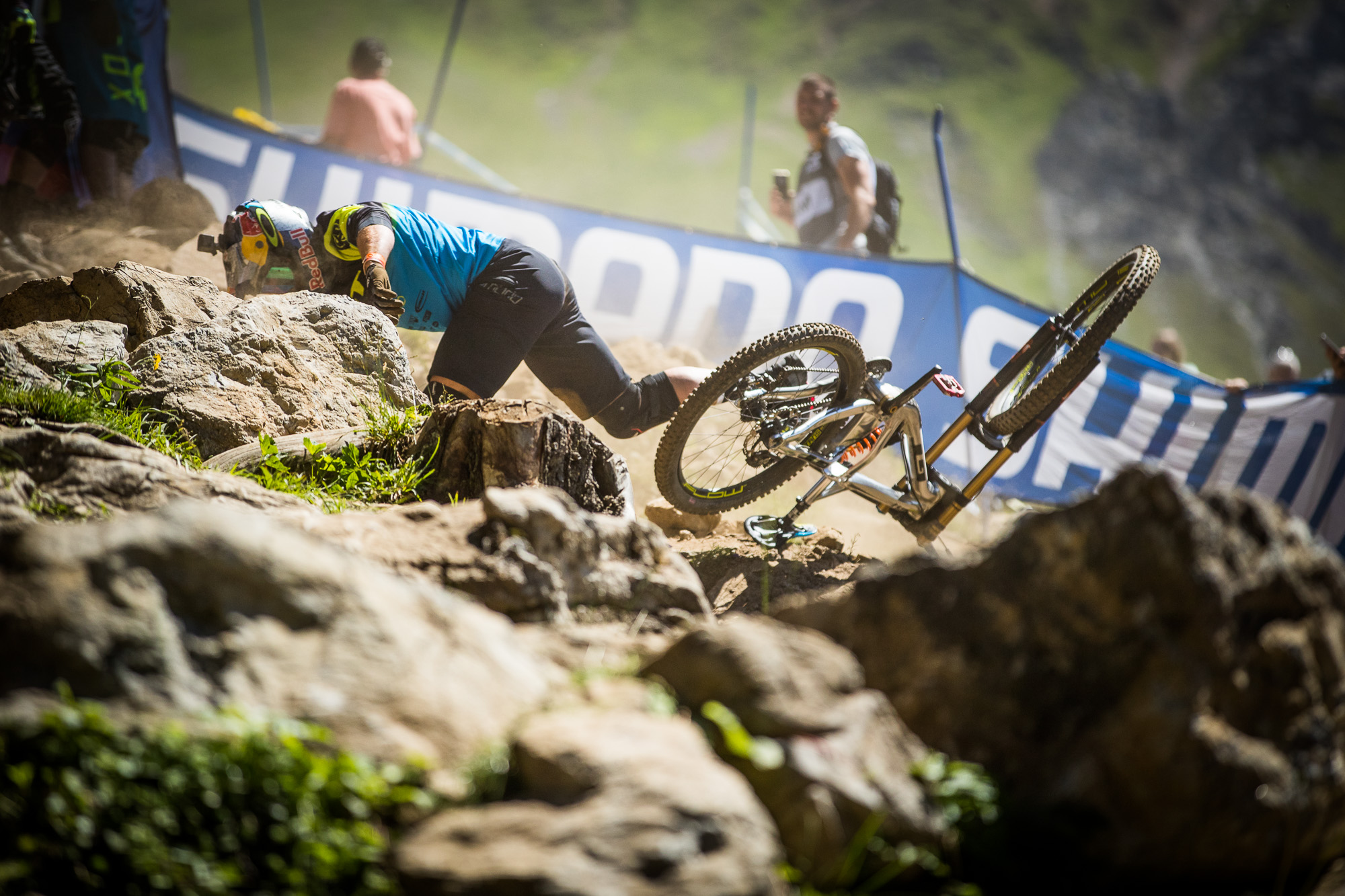 There were plenty of spills yesterday, most prominently in the top rock garden that’s more like a shark’s mouth than a mountain bike course feature, in truth, we’re not sure anyone’s found the perfect line through it yet.