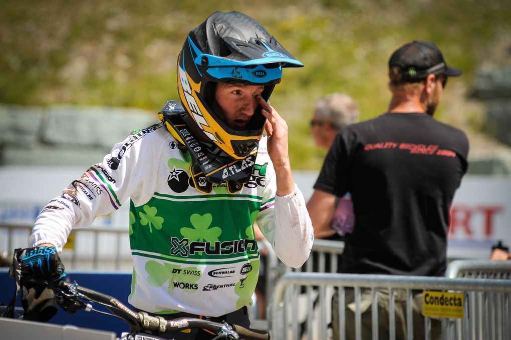 “1st run was going really good. Ben was up the top watching me, so I did the first rock garden nice, gathered some momentum through the next 3 or so corners, and then for some reason got red flagged. I’m not sure why though, the boy behind me just kept going, so I was a tad confused about that. Big thanks to Mick Hannah, he pushed my bike back up for me for my re-run. The UCI dude said I’d have to wait until the end, so I waited at the top for an hour and a half with Matti Lehikoinen, big thanks to him for babysitting. Dropped in for my second run and just took her way too steady. I’d injured my shoulder in practice and just couldn’t push that hard. It’s strapped up now and hurting like a b*tch so hopefully that heals up soon. Came down a dissapointing 97th so didn’t make the cut”.
