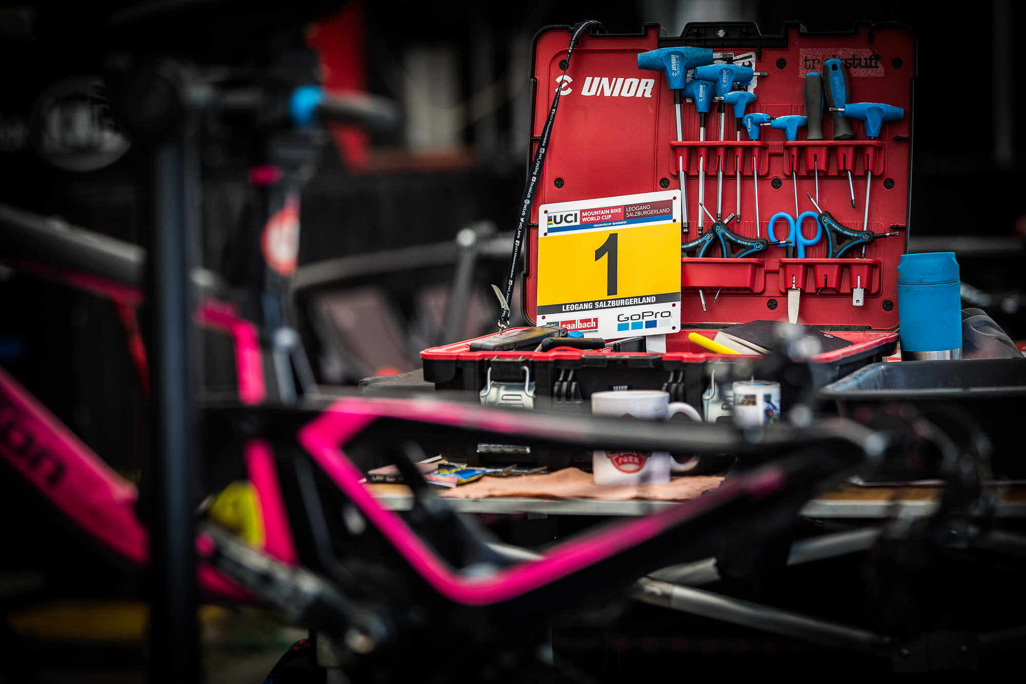 Leogang is probably the Indy 500 to Val di Sole‘s Monte Carlo – high speed, big consequences but, if we’re being honest, a bit tedious. Safe to say the riders aren’t exactly relishing the challenge (some are even calling for the return of the man made rock gardens from last year) of this course but that won’t stop them charging later today. Expect low profile tyres, shock lock outs and, dare we suggest, single crown forks?