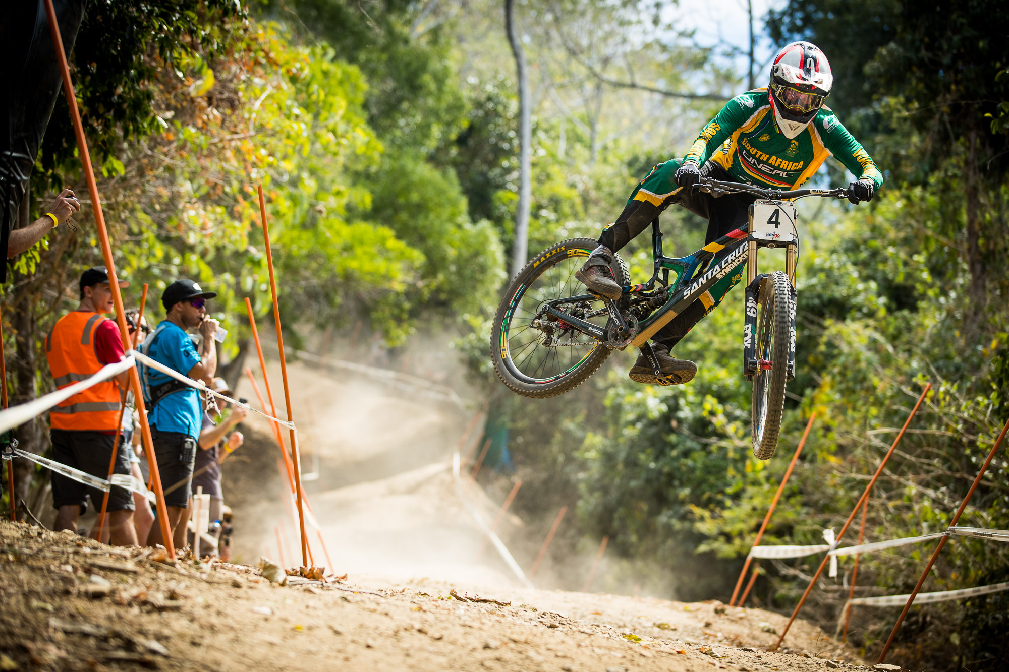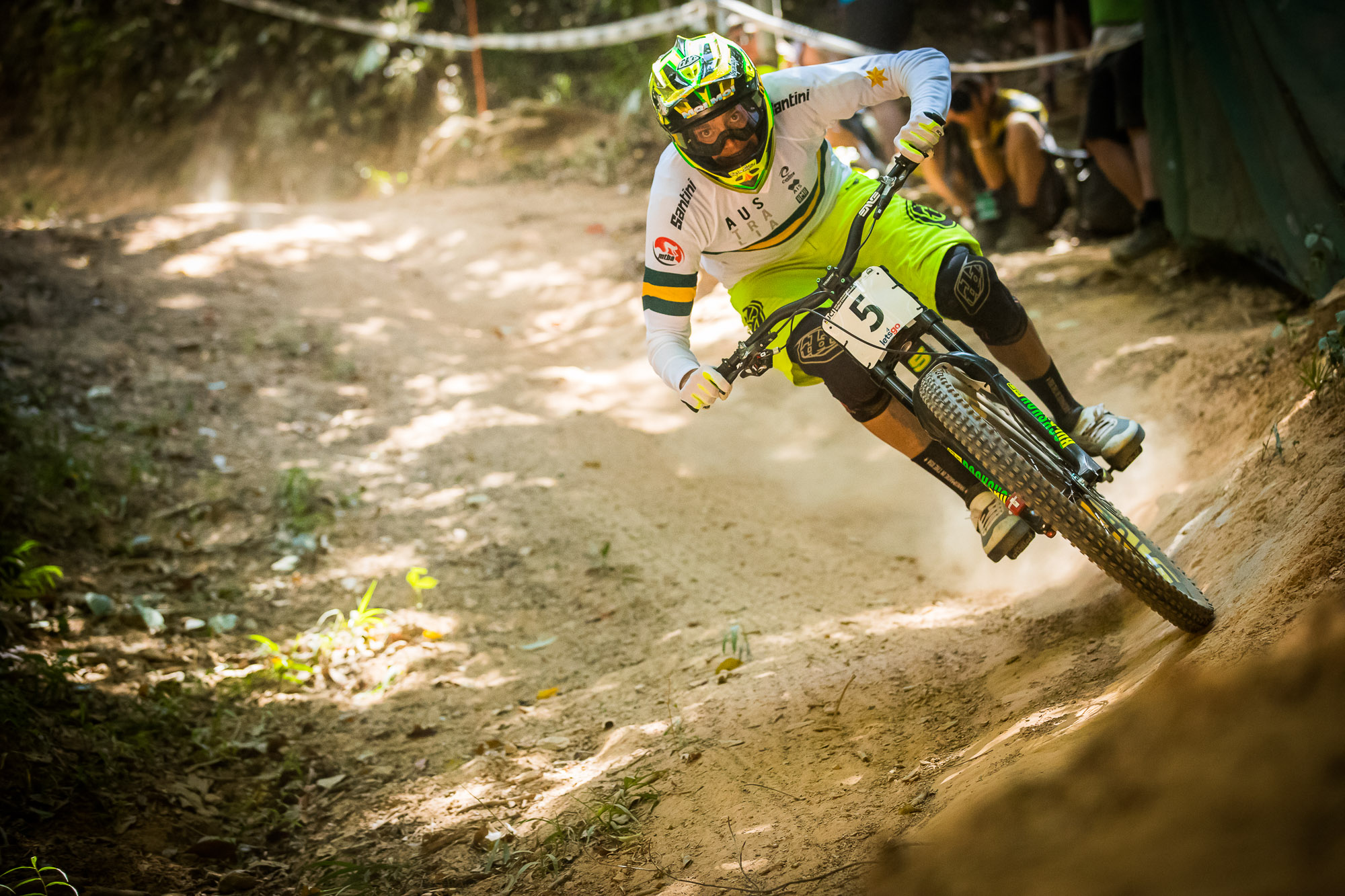 Danny Hart was up next hoping to defend the Rainbow Jersey he won in Val di Sole last year. On a track that probably didn’t suit him, he finished nine seconds back. All Australian hopes now had to be directed to Troy Brosnan at the top of the mountain.