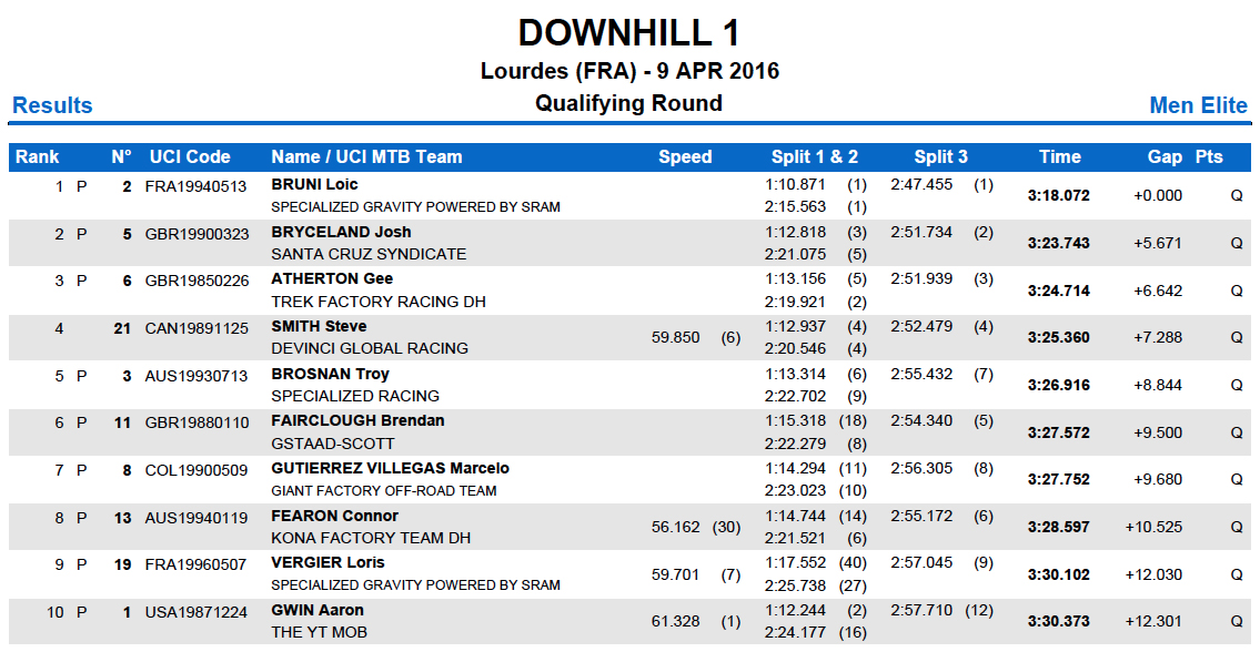 All eyes were on the hill as the world’s best charged down it. Current World Cup Champion Aaron Gwin crashed at the start of the fast off-camber section of track and had to scramble back to his bike. Greg Minnaar crashed in the same place but towards the end of the section, crashing in the exit of the turn. But it was the cool, calm and confident Bruni that pounded the rest of the field by over five and a half seconds! Here is the top 5 (great to see a resurgent Steve Smith there in the mix too and three Brits in the top 6, and of course that Steve Peat is in there):