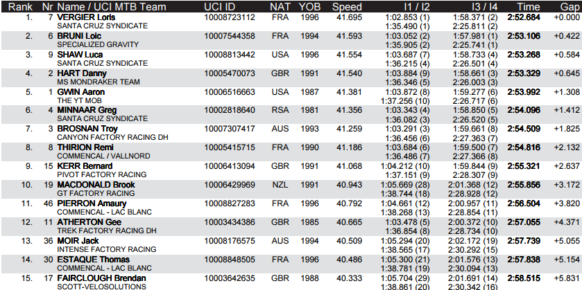 Vergier was sixth down the hill and his time of 2:2:52.684 never came close to beaten. Splitting the Syndicate members was Loic Bruni with a time of 2:53.106, just 0.1 ahead of Luca Shaw.