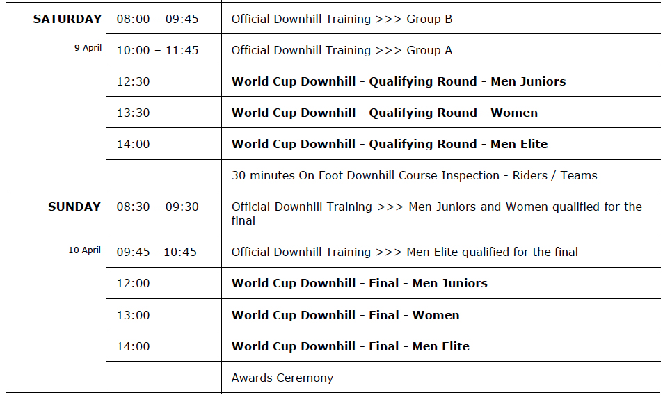 If you scroll down below you’ll find the timetable for Saturday and Sunday (race day), plus all the start times and riders for the qualifying tomorrow.