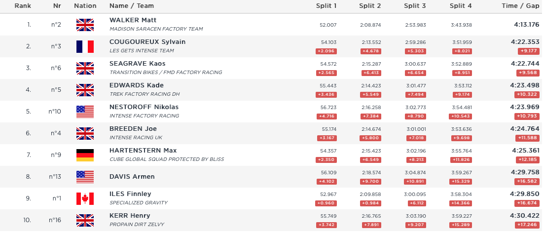 Fourth went to Kade Edwards, completing another session of Brit domination with Intense’s Nikolas Nesteroff in fifth. Local favourite Finn Iles finished way down the rankings nearly 17 seconds back on Walker, he must have had a problem on course as he was only a second back at split two.