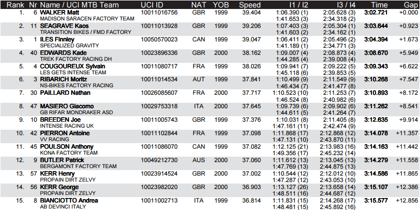 17-year-old Walker was only five seconds off Gee Atherton’s fastest time from timed training yesterday, not bad considering Gee set the course record in the process. Iles was first down the hill and his time of 3:04.394 looked strong until the Shropshire lad flew into the finish. Kaos Seagrave then looked loose as always but clearly pulled out a strong run, coming in at 3:03.644.