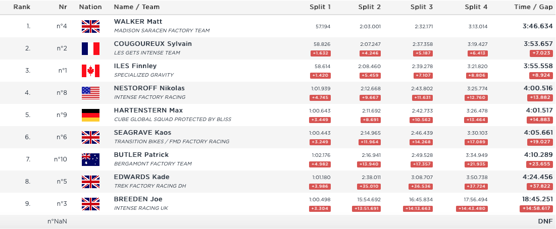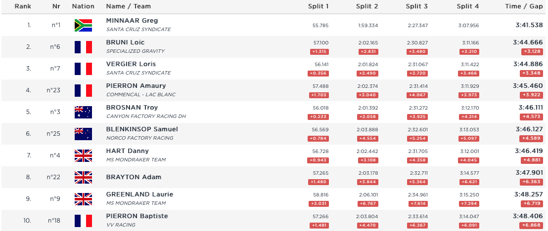 Second place went to Loic Bruni on one of the last runs of the session while Minnaar’s Syndicate team mate, Loris Vergier, finished third despite making up some time on the last two sectors.