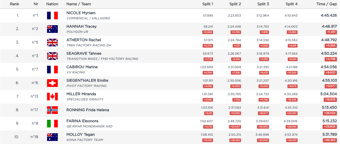 She was first down the hill and laid down an untouchable time of 4:45.426 to claim pole position. Title rival Tracey Hannah came closest to beating her but in the end fell 1.5 seconds back.