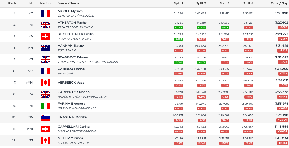 Nicole was able to leap frog yesterday’s top qualifier, Rachel Atherton, who is still carrying an injury from Fort William. Atherton was faster than Nicole through the first three sectors but was not able to carry that advantage down to the bottom.