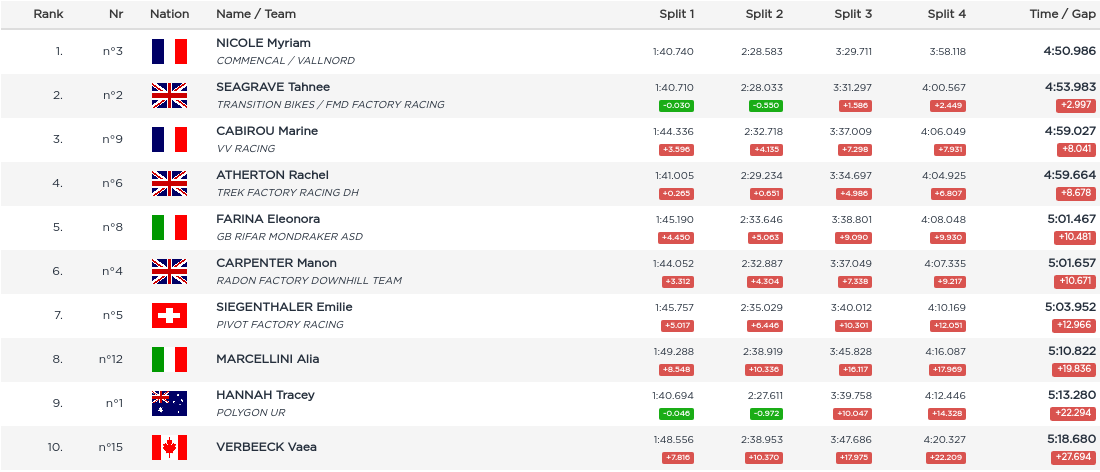 Next up was Myriam Nicole, spurred on by a semi-home crowd at Commencal’s local race. She was behind on the pedally top but came alive in the steep chutes, pulling back 3.5 seconds over the final part of the track to take the hot seat.