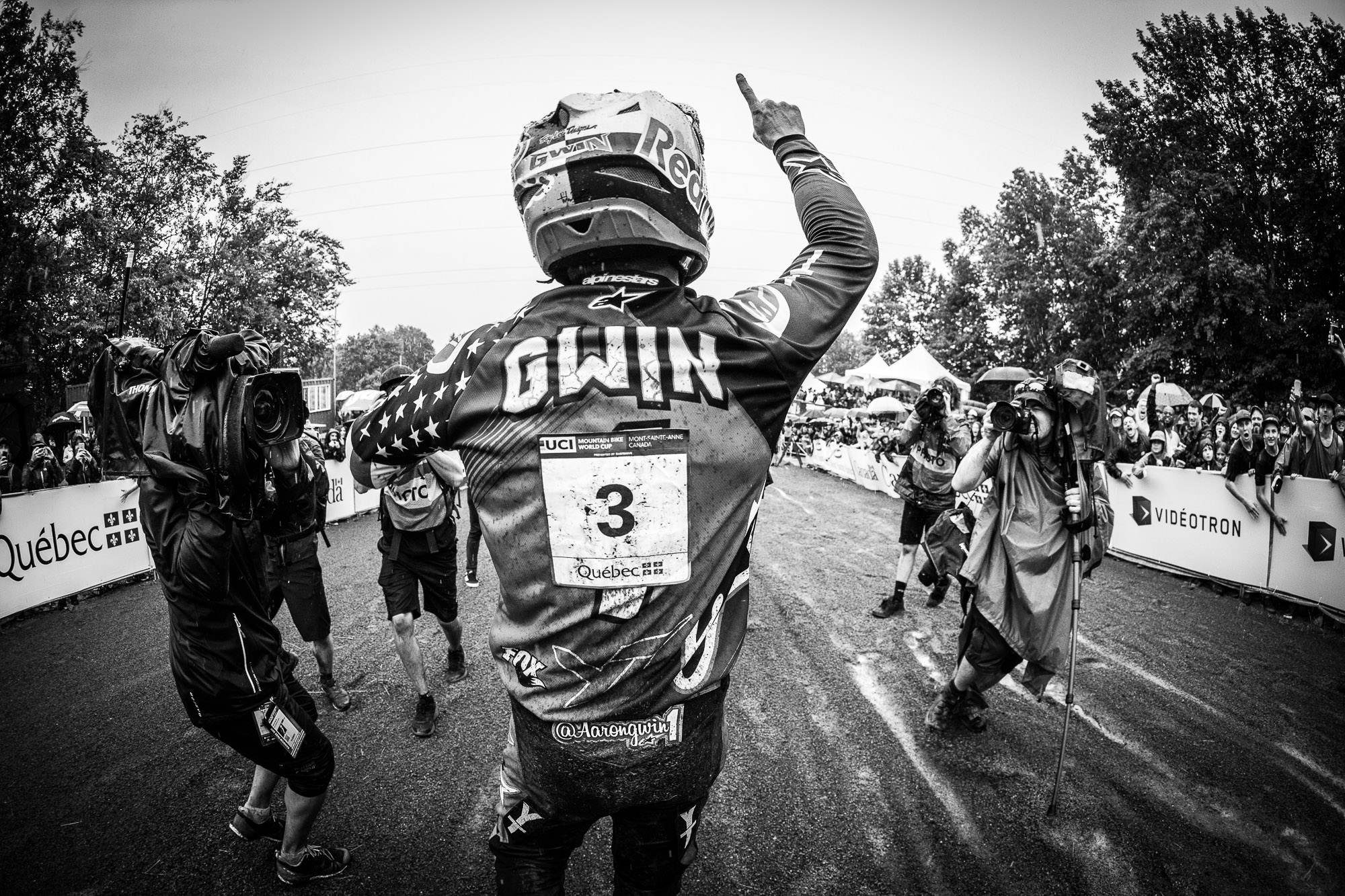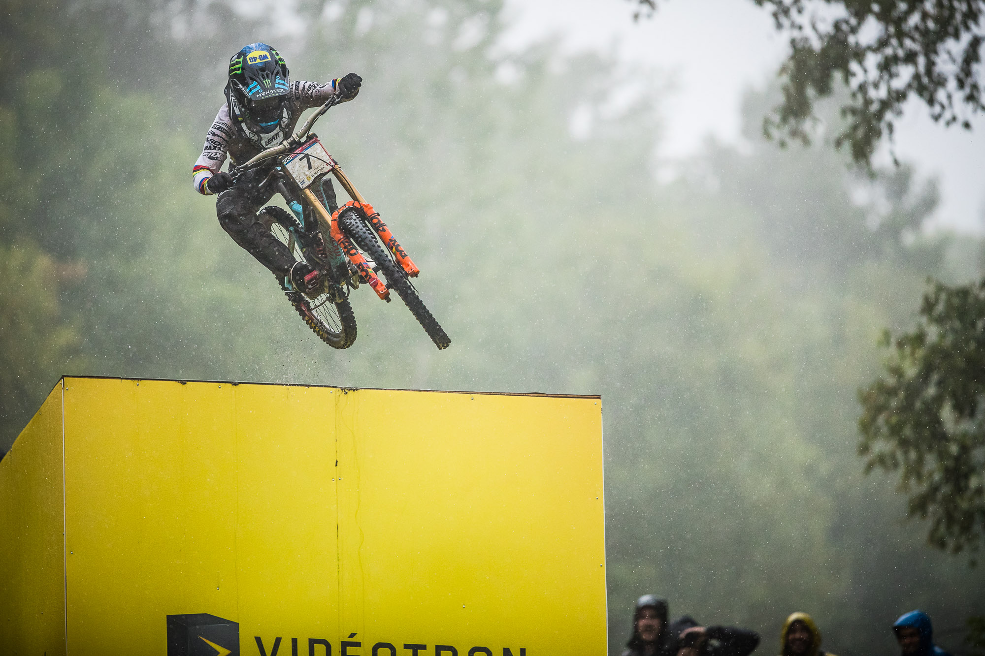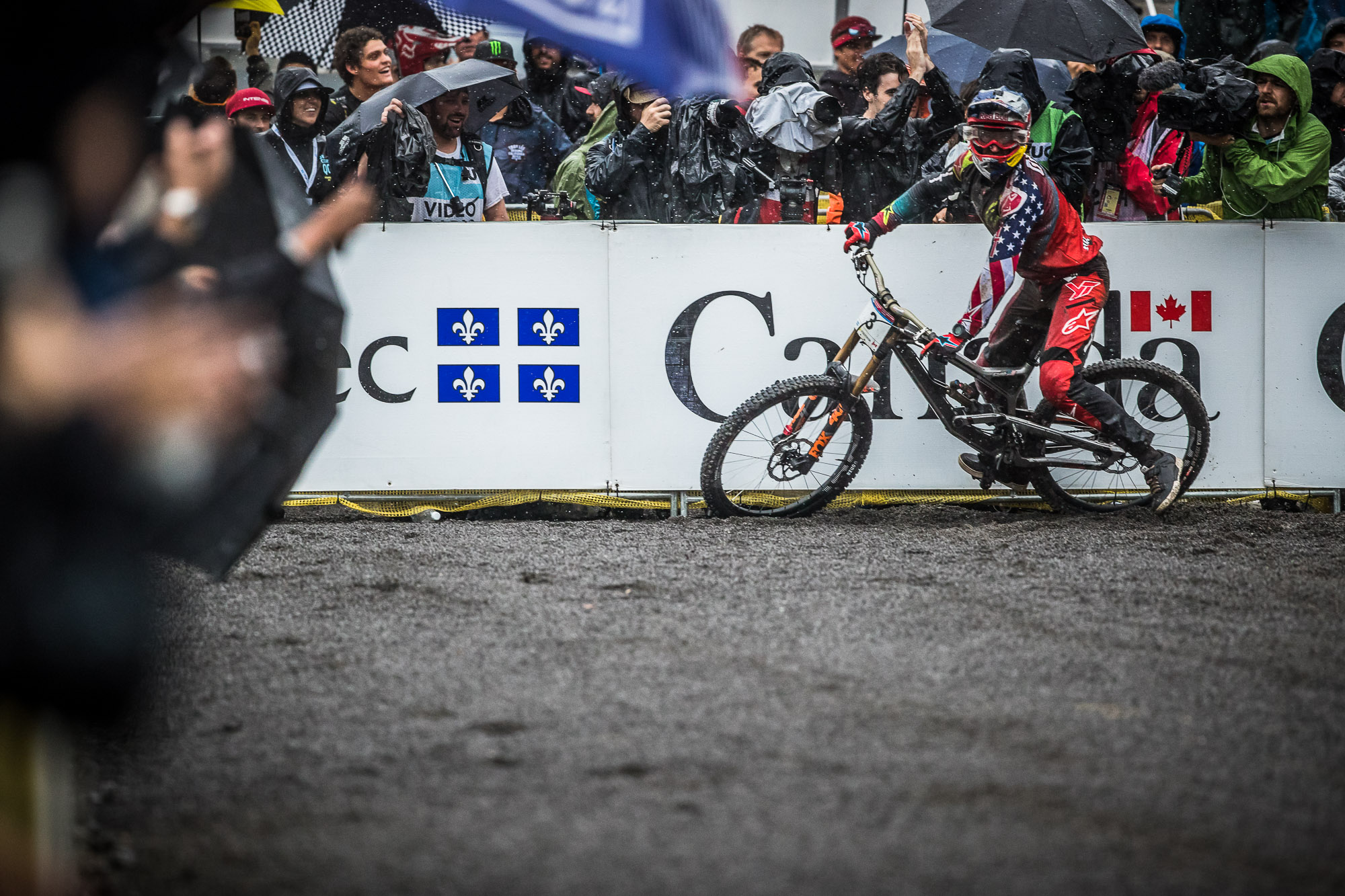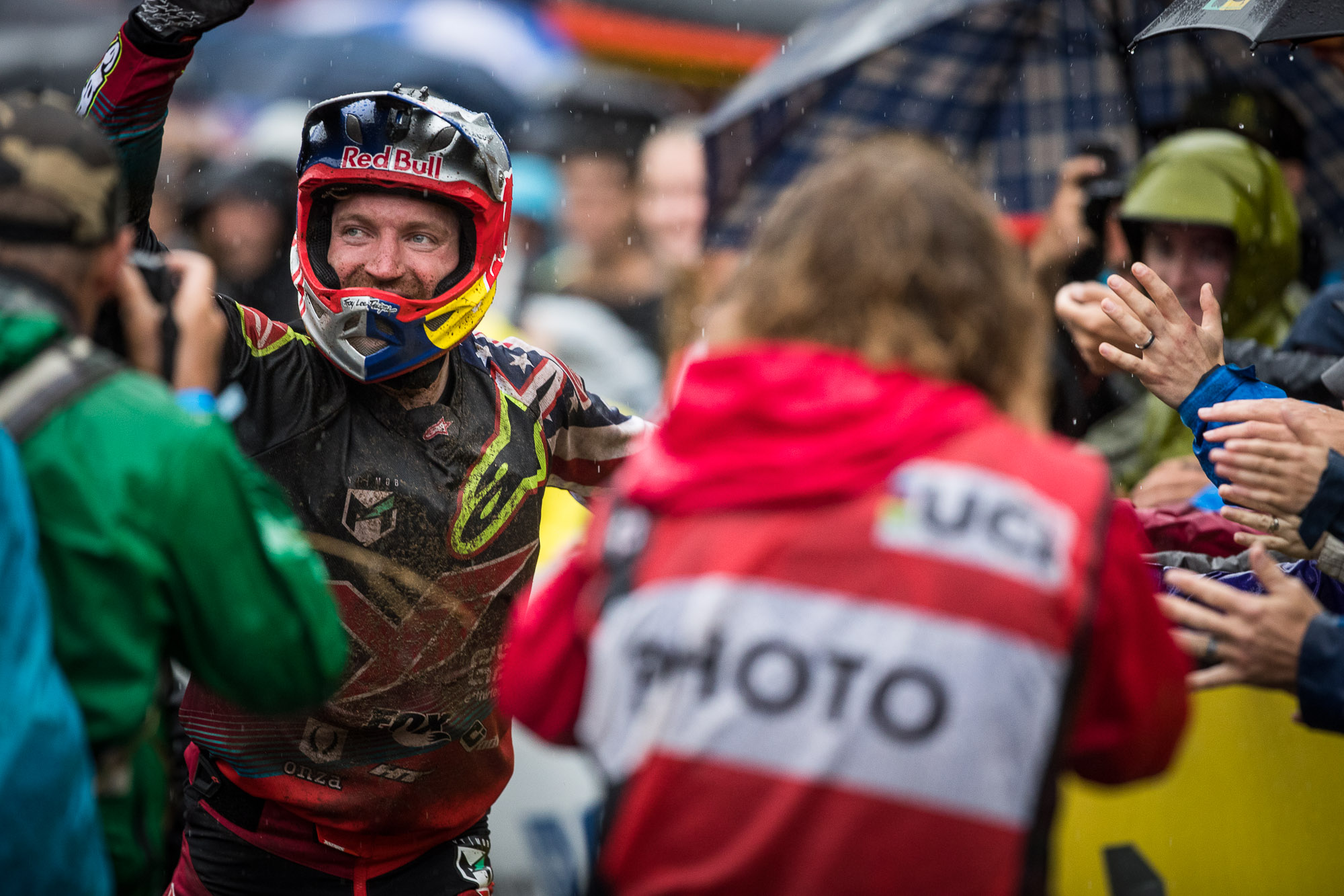 There’s nobody else in the downhill field that could win on a pedally track without a chain and there was nobody that could part the puddles like Gwin yesterday. While Gwin glided, others floundered. Minnaar was the biggest loser sliding his front wheel over the top of a berm on a supposedly safe run. He re-entered the tape wrong and was DQ’d as a result.