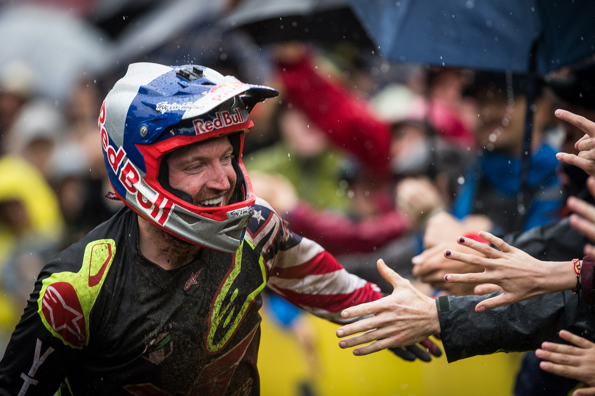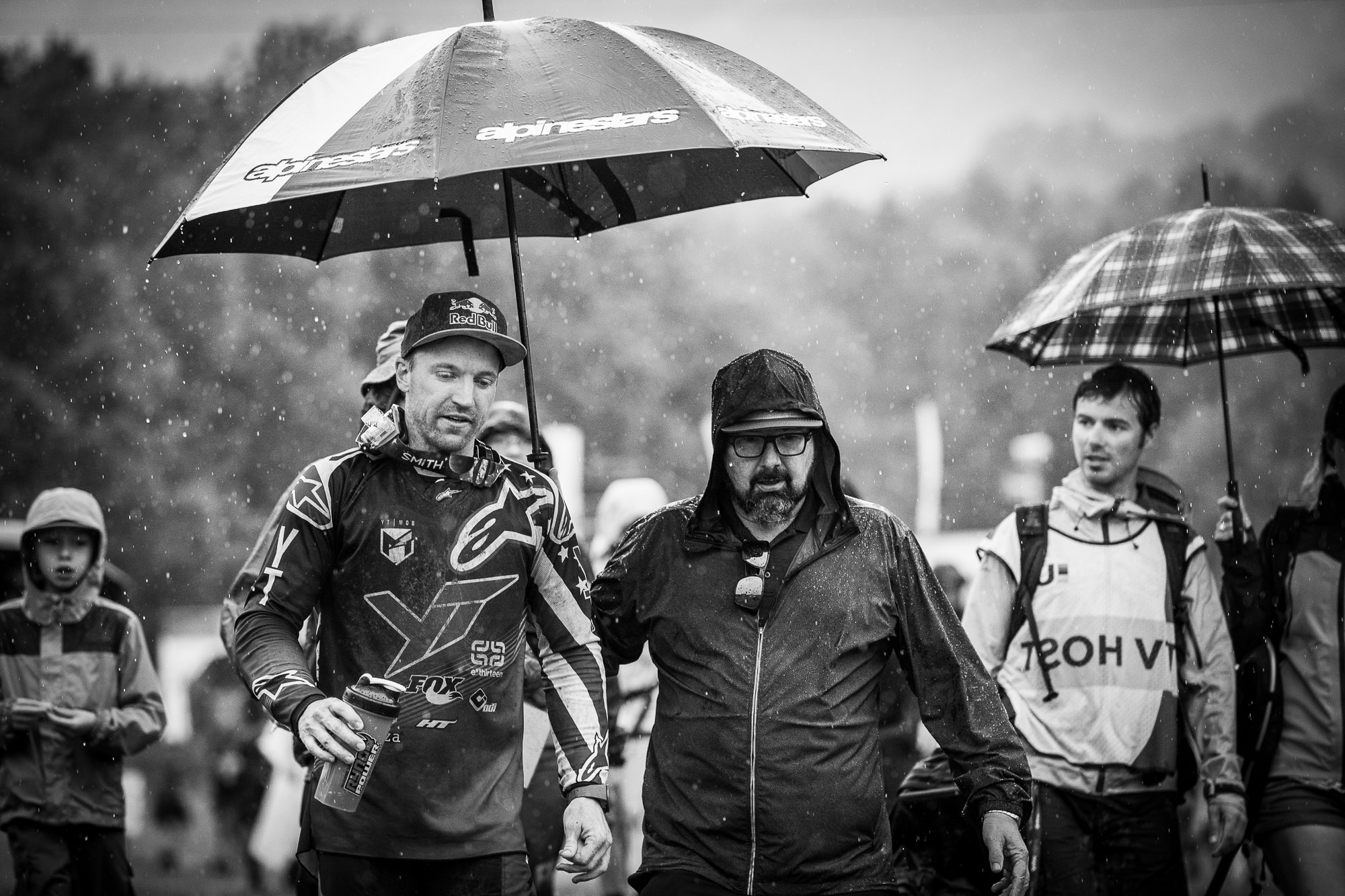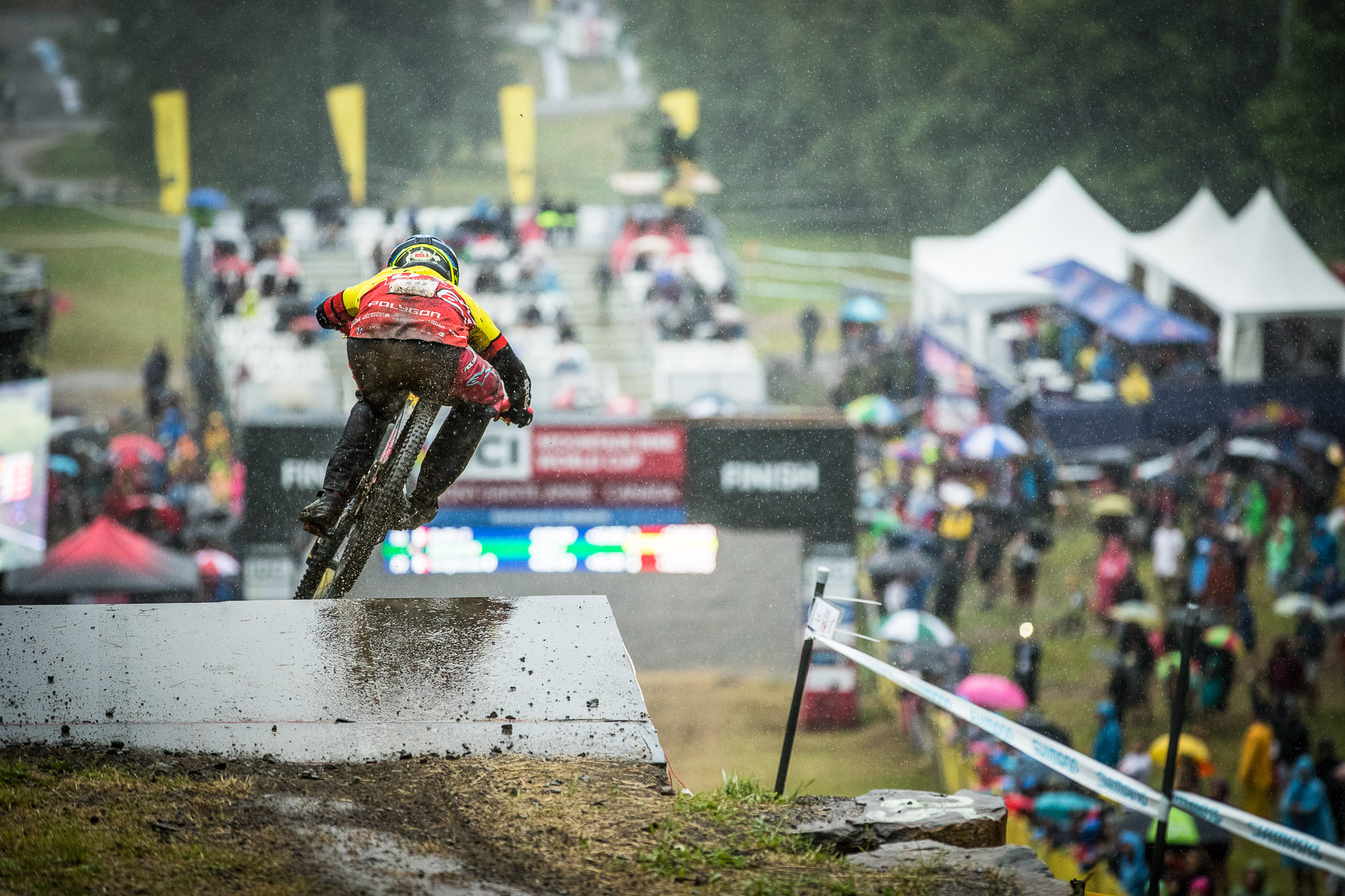 There’s nobody else in the downhill field that could win on a pedally track without a chain and there was nobody that could part the puddles like Gwin yesterday. While Gwin glided, others floundered. Minnaar was the biggest loser sliding his front wheel over the top of a berm on a supposedly safe run. He re-entered the tape wrong and was DQ’d as a result.