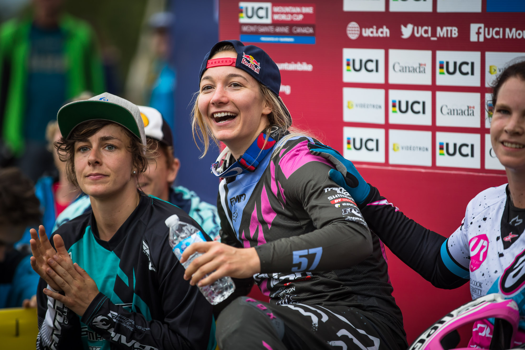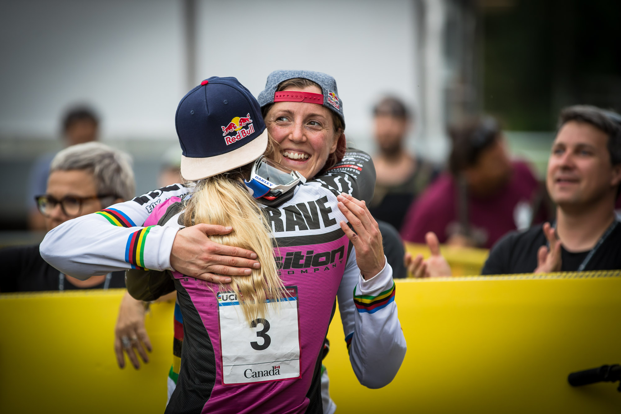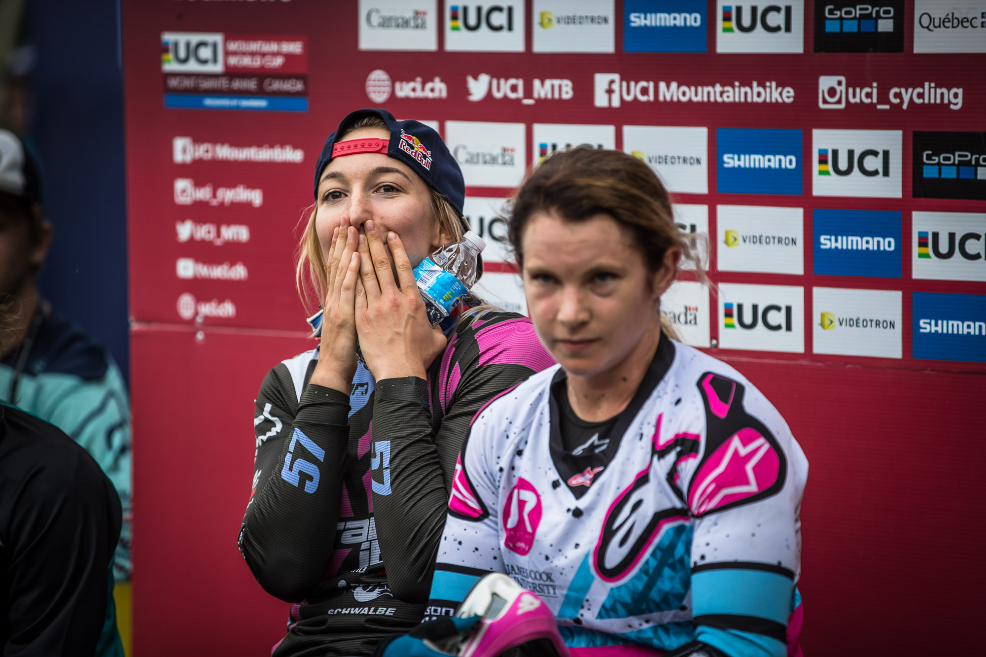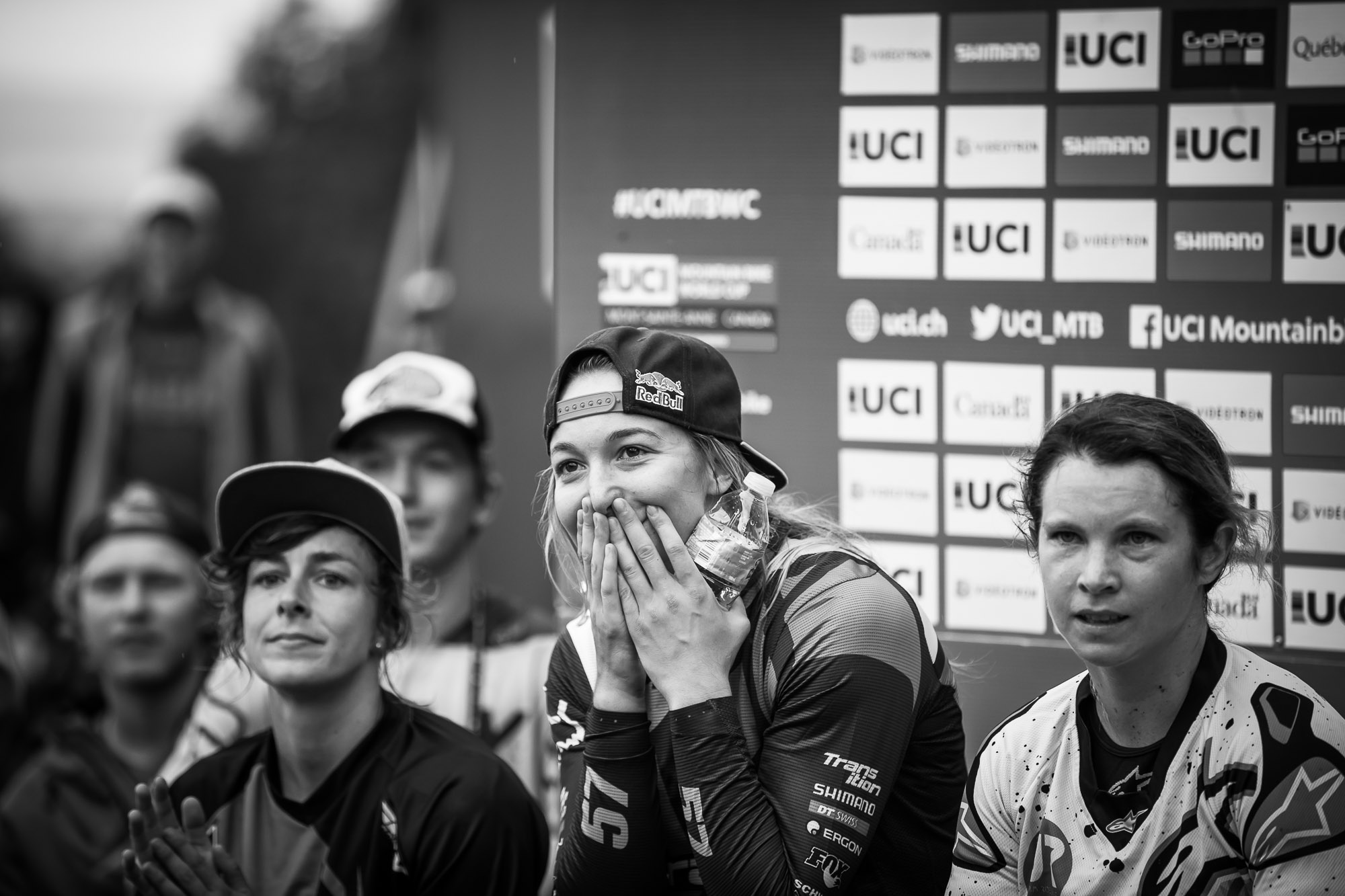 In the women’s race it was Tahnee’s turn to shine against grey Canadian skies. It was her second World Cup win and her first on a downhill track. Nicole must be starting to feel safer at the top of the standings with a 110 point buffer over Hannah heading to a track she loves but as we saw here, anything can happen.