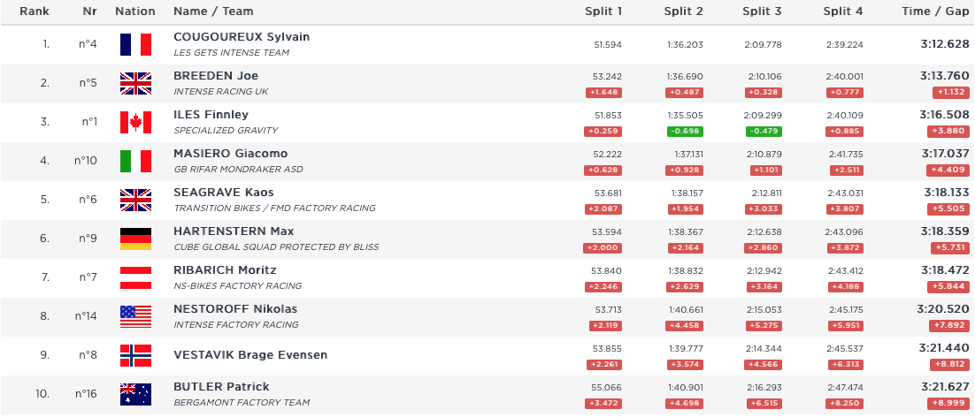 Third place went to series leader Finn Iles, who was nearly four seconds off on the top time. We assume he had an issue up on track because he was bang on Cougoureux’s case until the final sector. Italy’s Masiero Giacomo was fourth and Kaos Seagrave fifth.