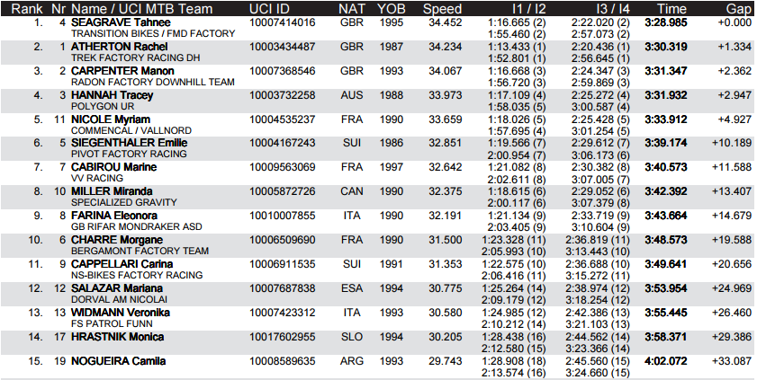 Rachel Atherton’s dominance from timed training didn’t translate in qualifying pace today as she was pipped by Tahnee Seagrave.