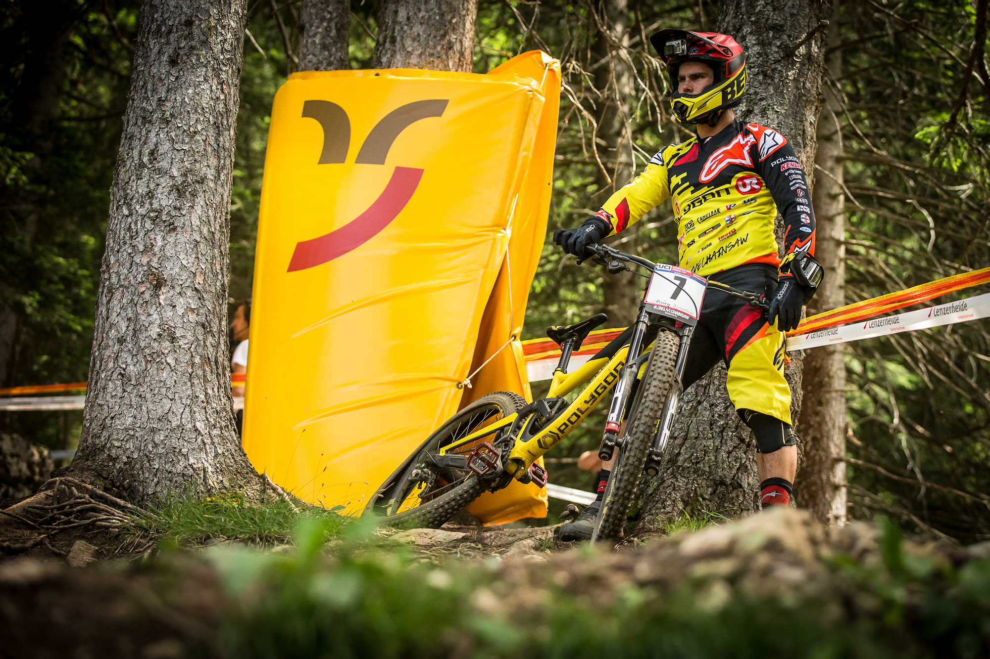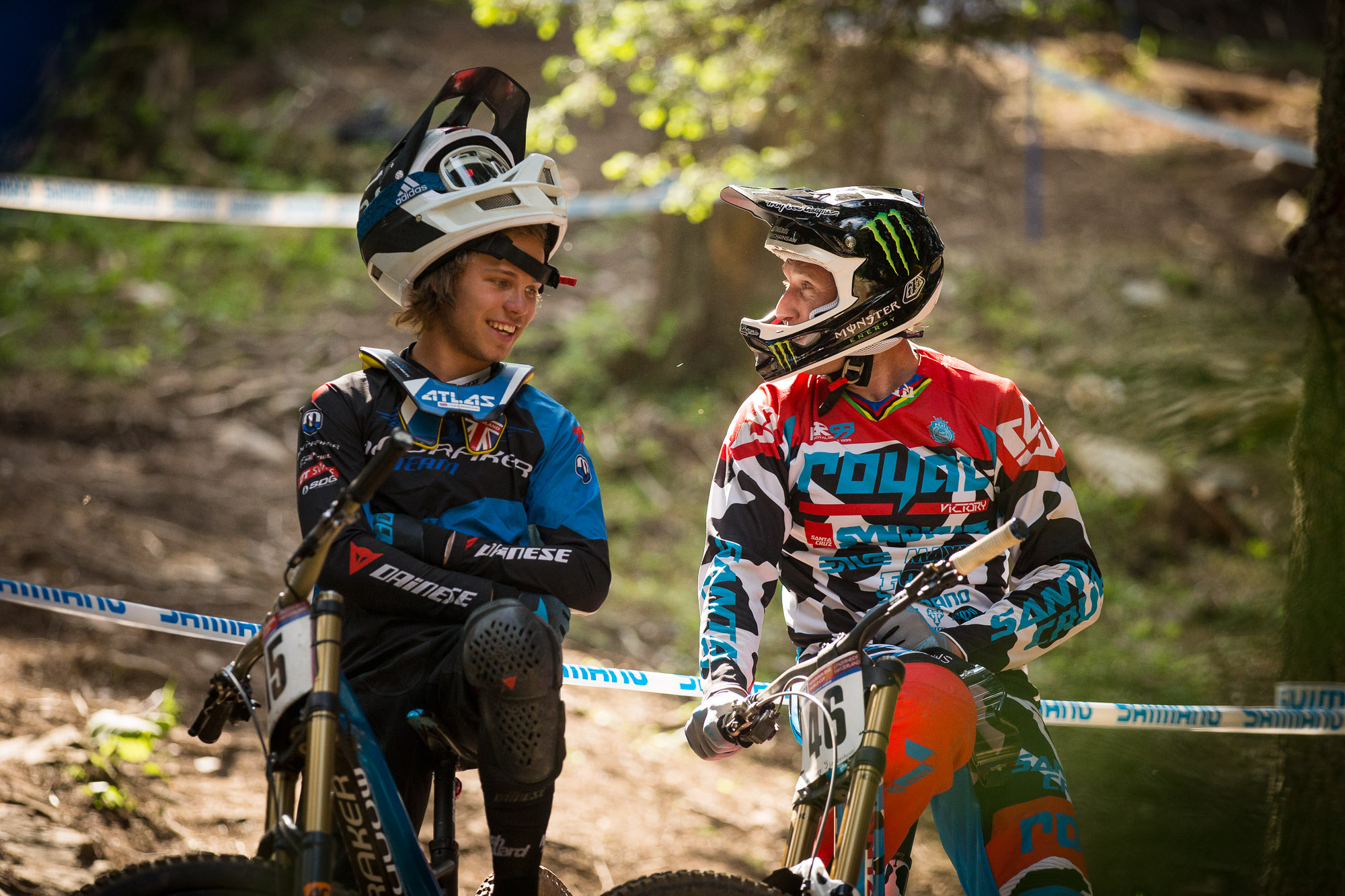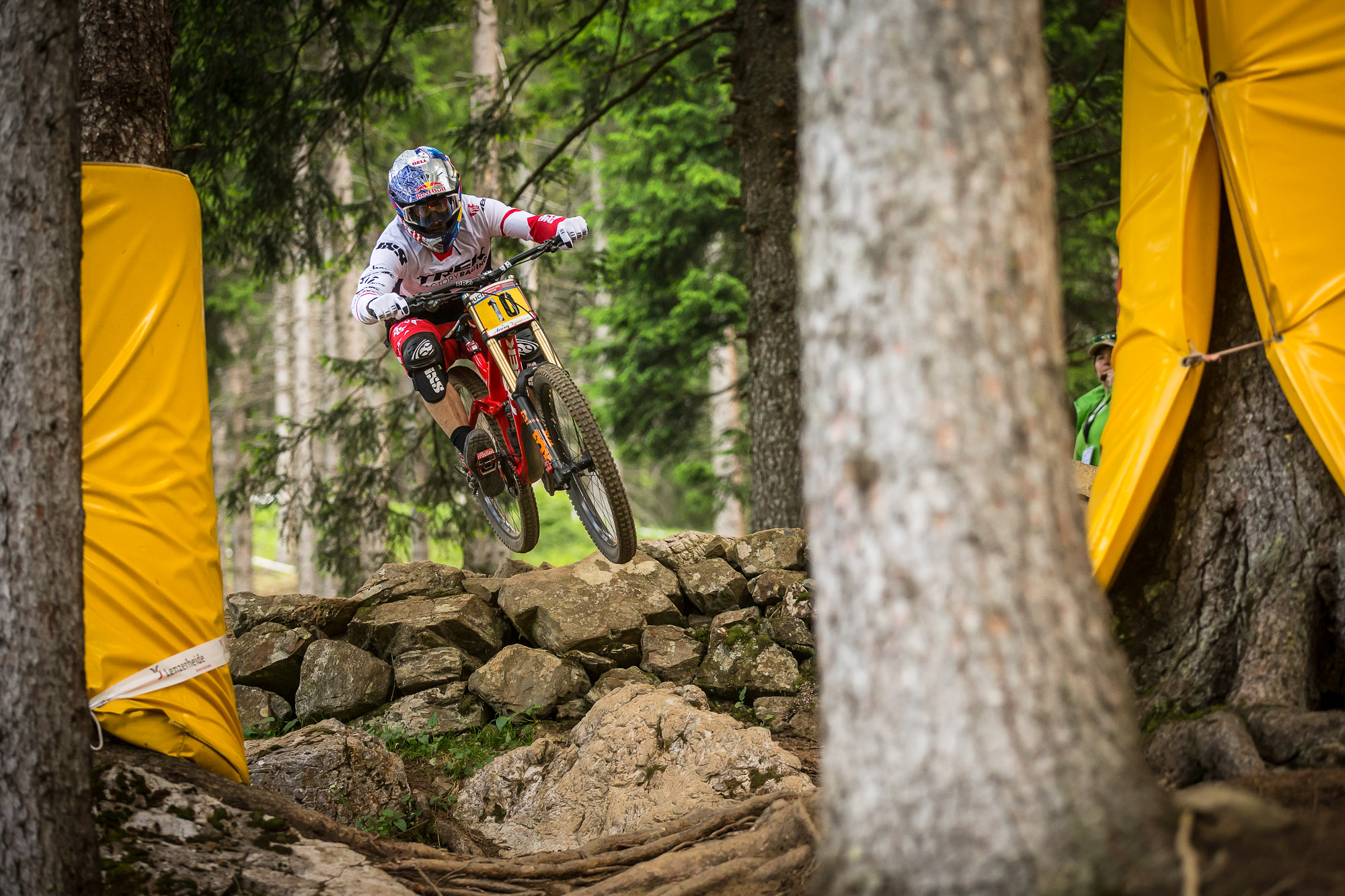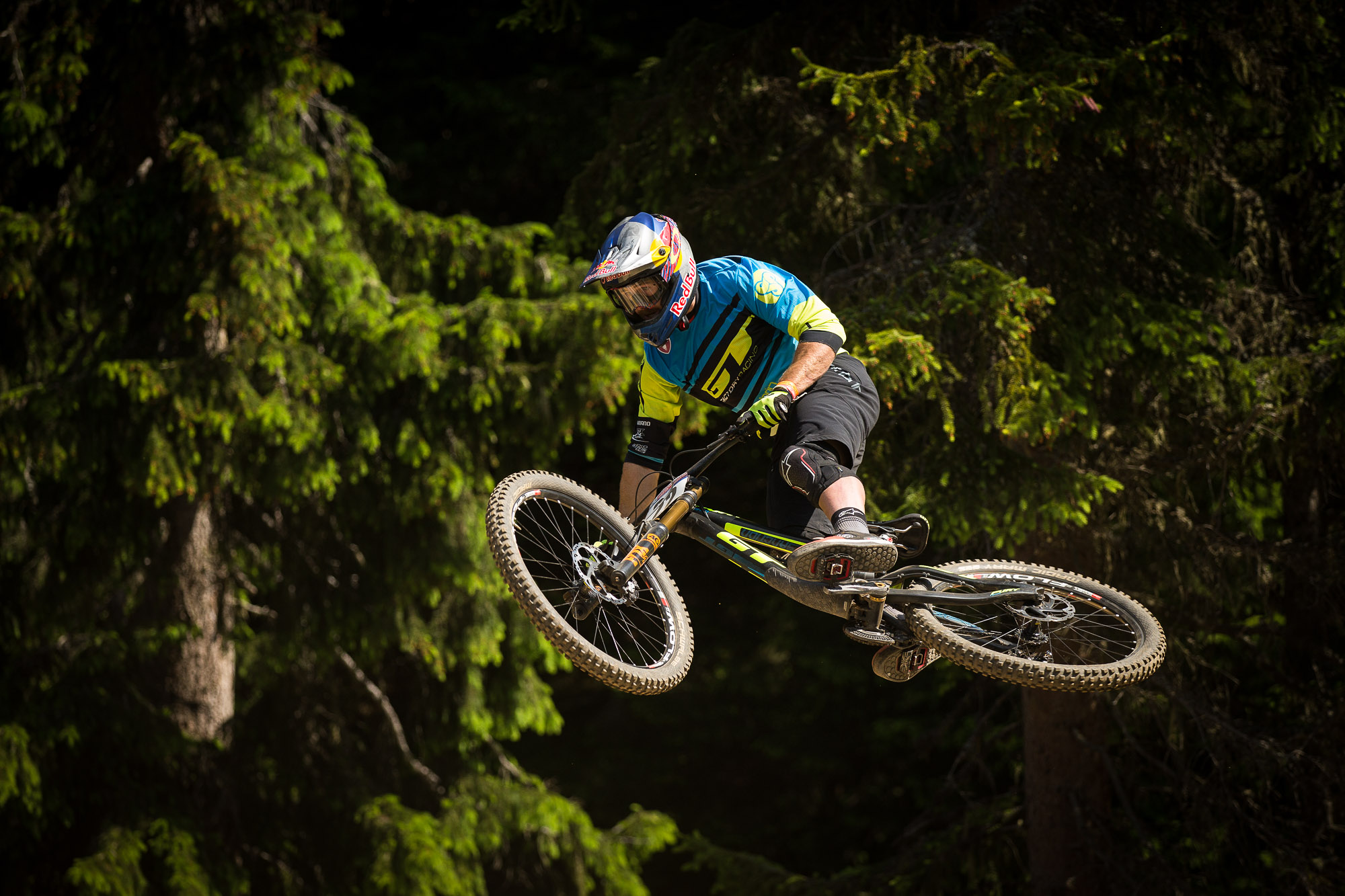 Gee Atherton didn’t have much fun up there either, but the biggest loser of the day was current series leader Aaron Gwin. There is no doubt that Gwin is the one to watch, the man of the moment. Second at split one, second at split two (but only by a tiny amount) it all went wrong in the woods and on the now infamous ‘Plunge’ (broken legs, broken commentators). He came into the rooty section before it pretty hot, unclipping one foot as the back end of his bike swung around behind him. Both feet then unclipped, he tried to get back on his bike but with his seat and pants getting slightly tangled he ended up kind of buckarooing about as he tried to regain some kind of control. He went off ‘The Plunge’ not in control and ended up over the bars and down the track… it was not a pretty sight. Thankfully he got up immediately and carried on with his run. Lets hope there is no serious injury for race day.