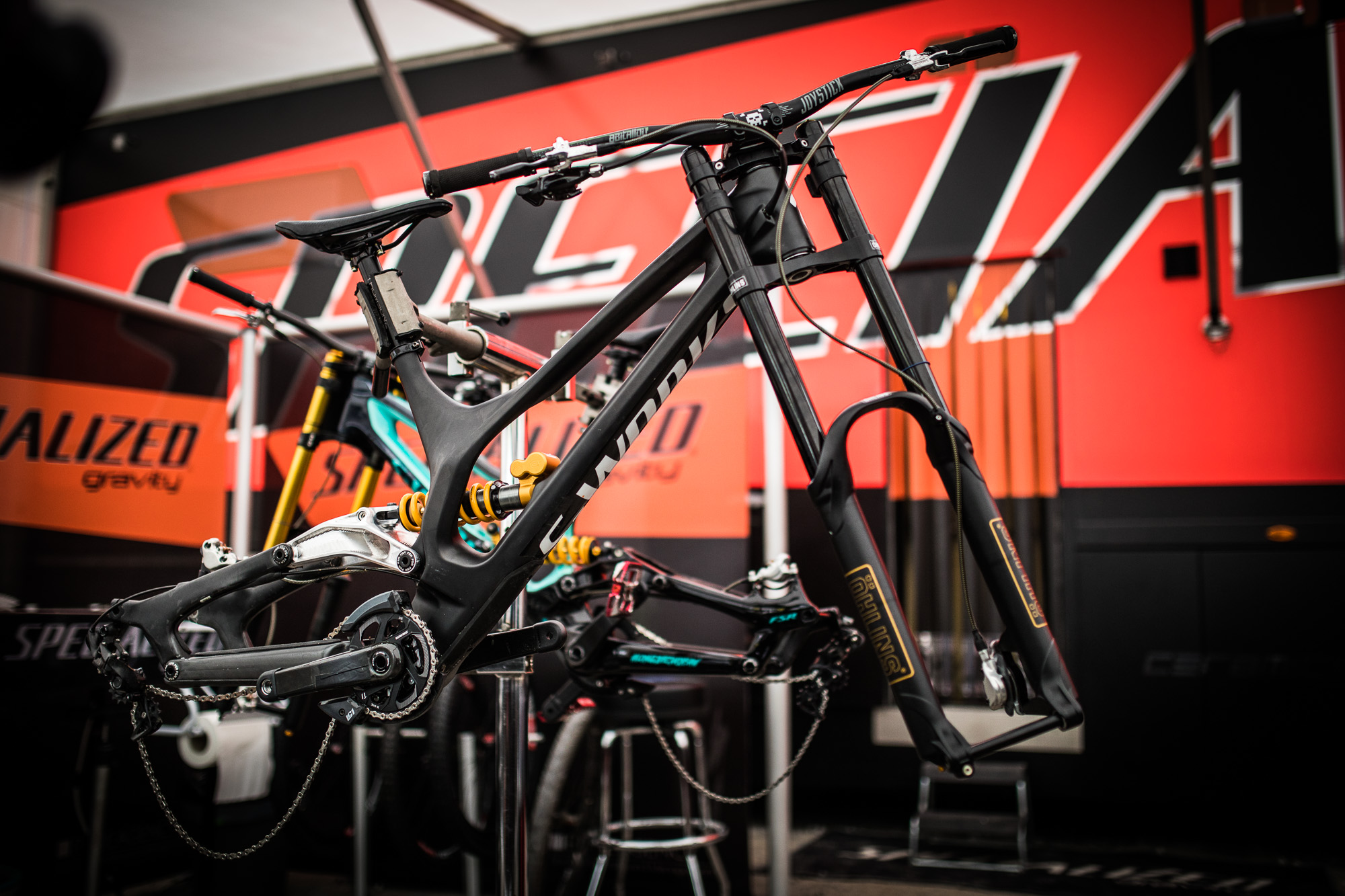 The unknown factor this weekend will be the chasing pack that are either already on the 29 inch wheels or secretly wishing they were. Revealed today was Loic Bruni’s, although he’s adamant he won’t actually be throwing a leg over it until he’s done more testing, for now it’s just a statement and a warning to decorate the front of the pits.
