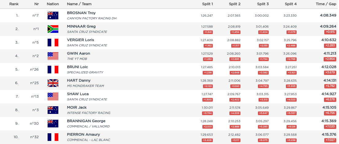 He put down a time of 4:08.349 to give himself nearly a second’s breathing space over the rest of the field. This is the first big statement form the Canyon team on the World Cup circuit and it comes on the back of Troy’s win in Crankworx Les Gets. Brosnan getting up to speed on the deadly Sender could well be a potent combination for the rest of the season.