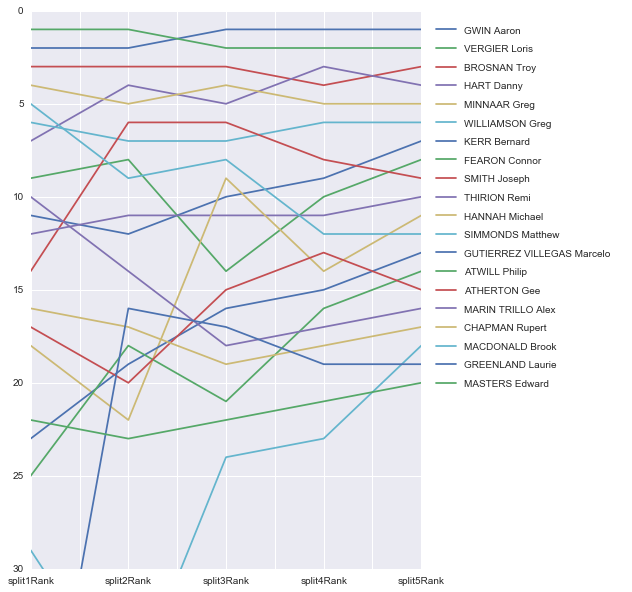 It’s really interesting to note in the position tracker that the top 5 were consistently fast, with no one crashing out. The eventual top 5 held the podium places at every sector with the exception of Danny Hart in 7th at split 1. The other interesting riders are Bernard Kerr who started relatively slowly but made up positions consistently from split 2, and Mick Hannah who smashed the middle jump section but then fell back again – see the big spike in his position at split 3. He can’t be too unhappy with 11th place though, especially with a sweet no hander on the finish jump!