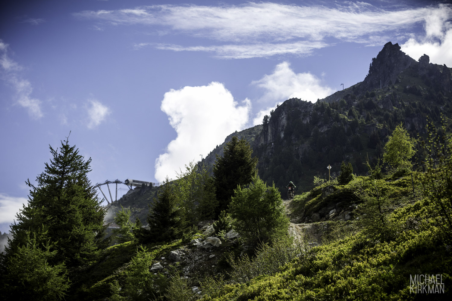 The weather was a pleasant surprise Saturday as rain was on the cards, but the sun shone most of the day and the same occurred Monday for the final three stages of the event. Up the funicular and chairlift and it was straight back down one of Les Arcs DH trails, halfway cut across the piste and resort (which was interesting as a large excavator was in action here and had to raise his bucket for us to go under!) to join bike park trail to finish up, lengthening the track out to over seven mins.
