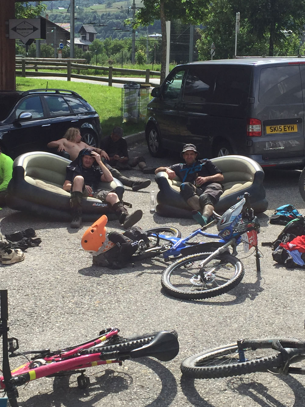 A BIG day on the bikes, six stages to complete and this time we didn’t have the luxury of passing HQ and our van at all, so our packs were laden with extra food an drink to see us through. Up early in the queue to ride at the front again, up the funicular and chairlift, then some slight confusion with wind blown course tape meant a large pack of riders getting to stage one at the same time, not before we got to warm up by rolling through the bike park stage one from yesterday that is (this was way more fun without being against the clock!).