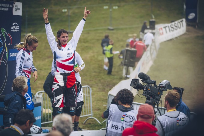 Riding high on confidence is a big part of this sport, the mental game is where it’s won and lost at the highest level. Manon Carpenter linked together a run that was collected and smooth. She took the top spot from Tahnee Seagrave who has excelled in her first year in Elite and she was only knocked out of the hot seat by fellow Brits. It was Manon who slipped into first place with only Atherton to come down the hill. Crossing the line the lights were red for Rachel and Manon threw her arms aloft, winning the World Champs just weeks after lifting the overall trophy in Meribel Manon rode a wave to the end of her biggest season so far. Three British women filled the podium in Hafjell and proved that the UK has the best of global DH talent.